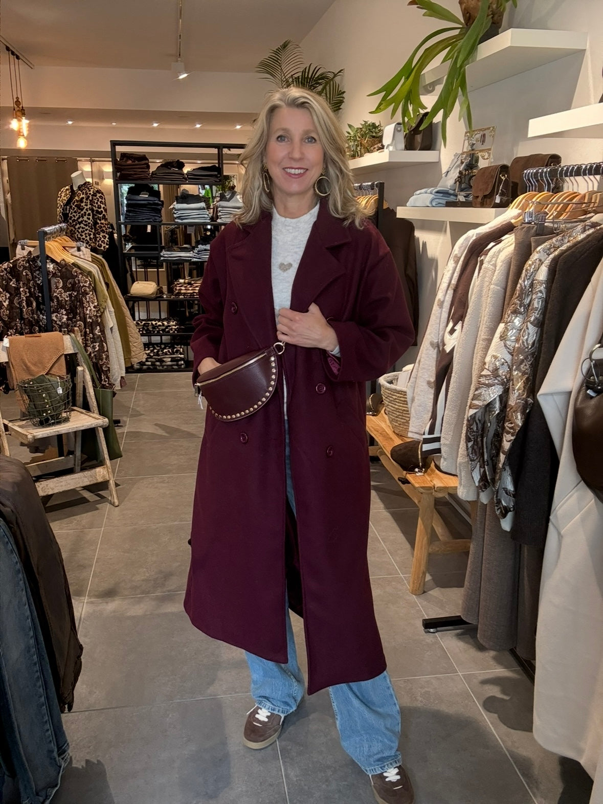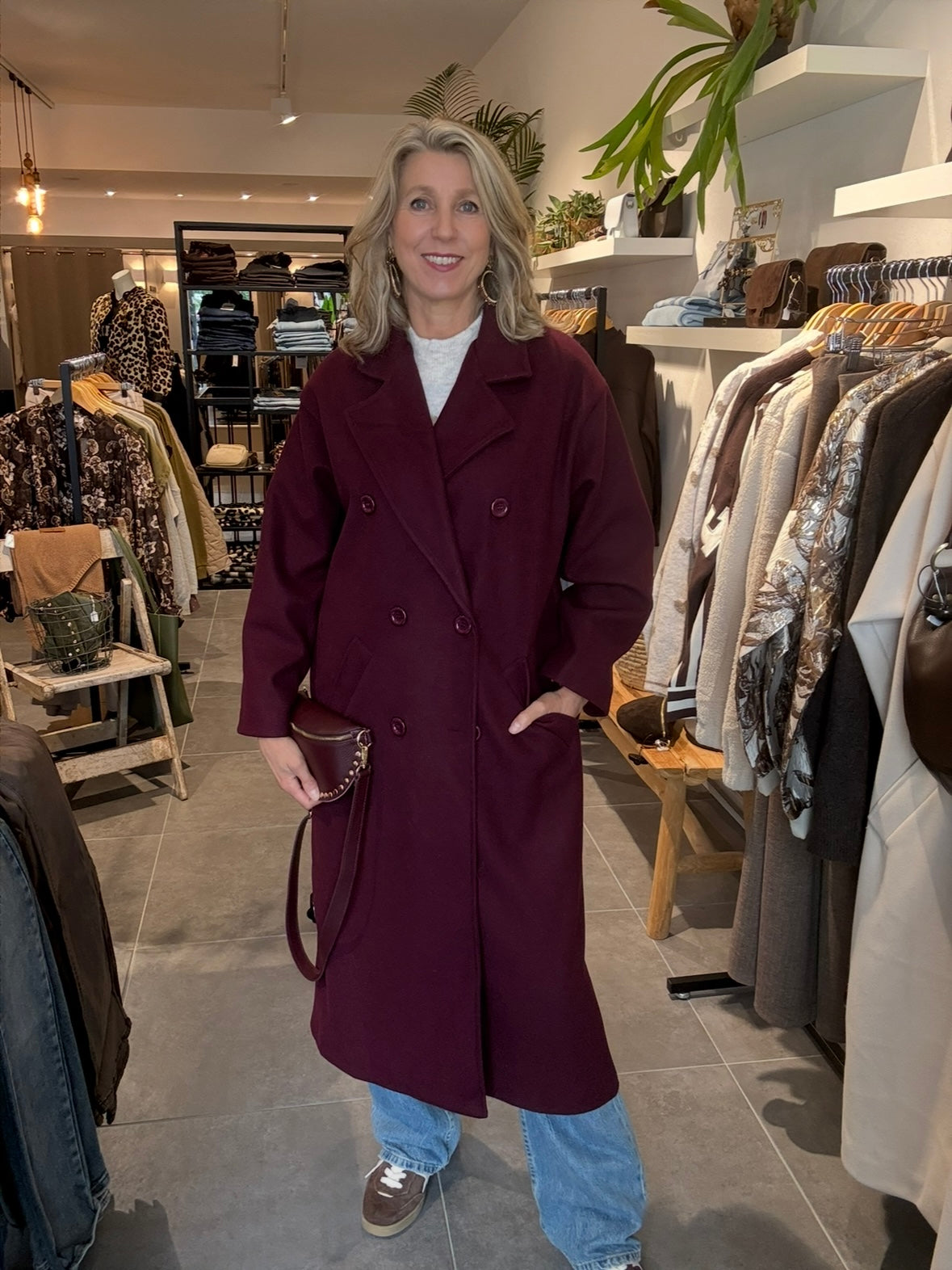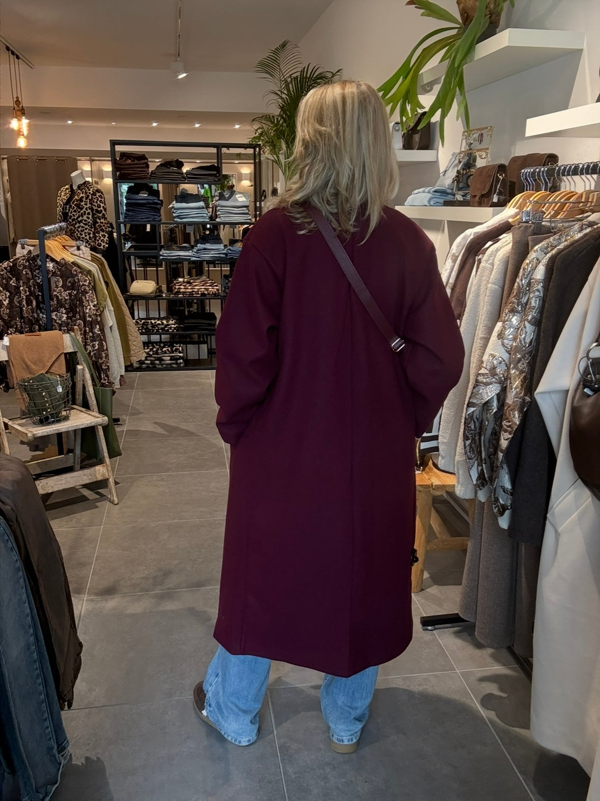 Lange mantel met knoopsluiting. De jas is gevoerd.