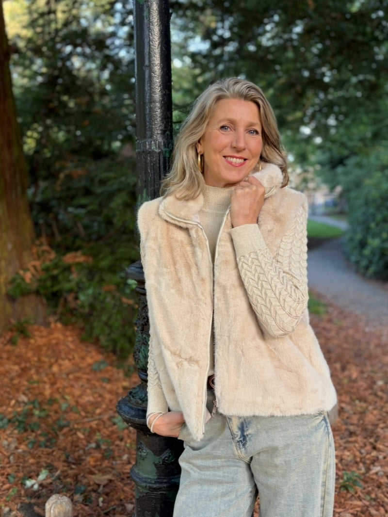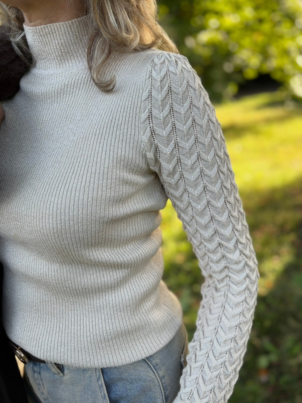 Een fijnbrei trui met korte col en glitters in de stof verwerkt. De trui heeft pofmouwen.