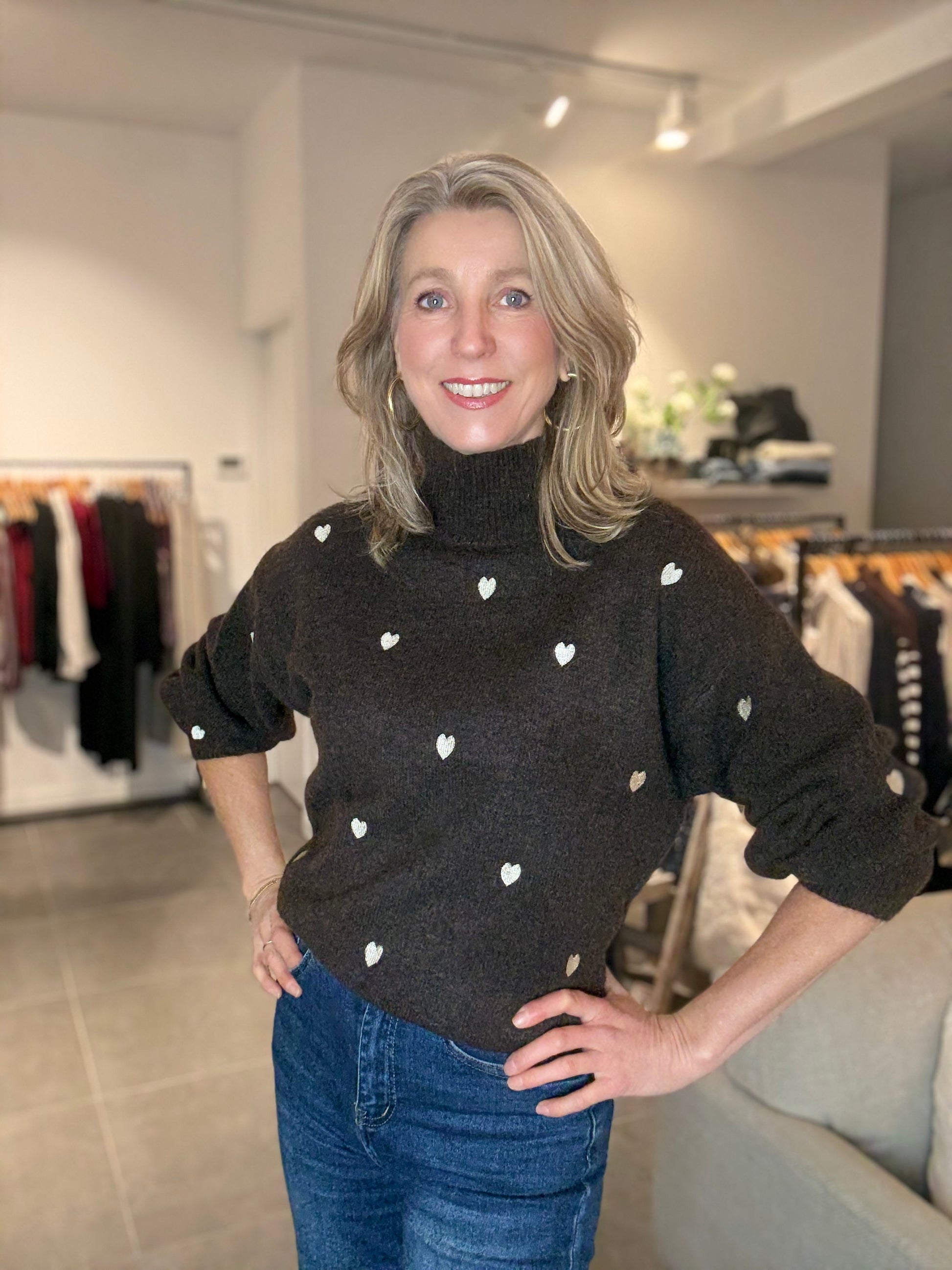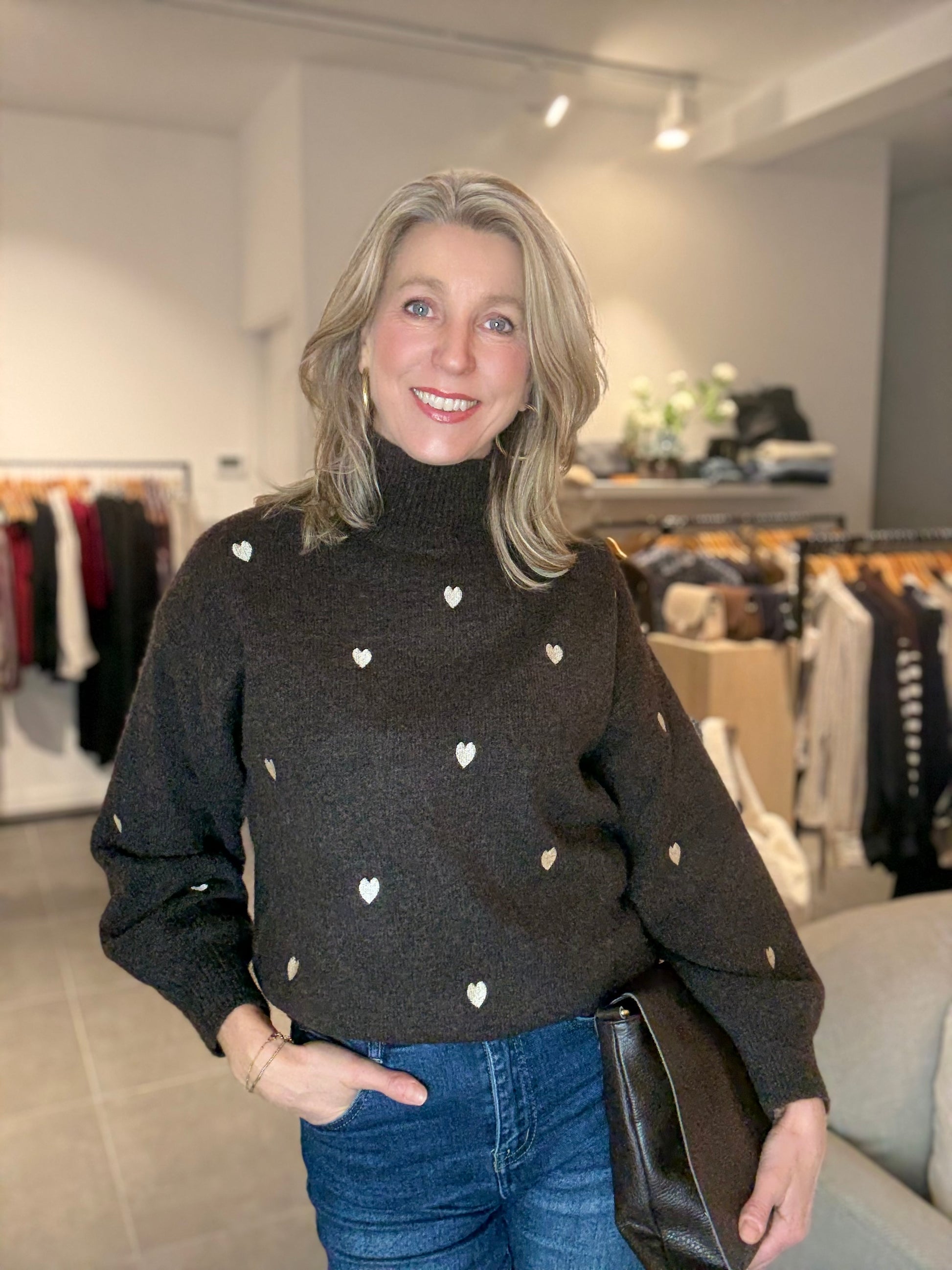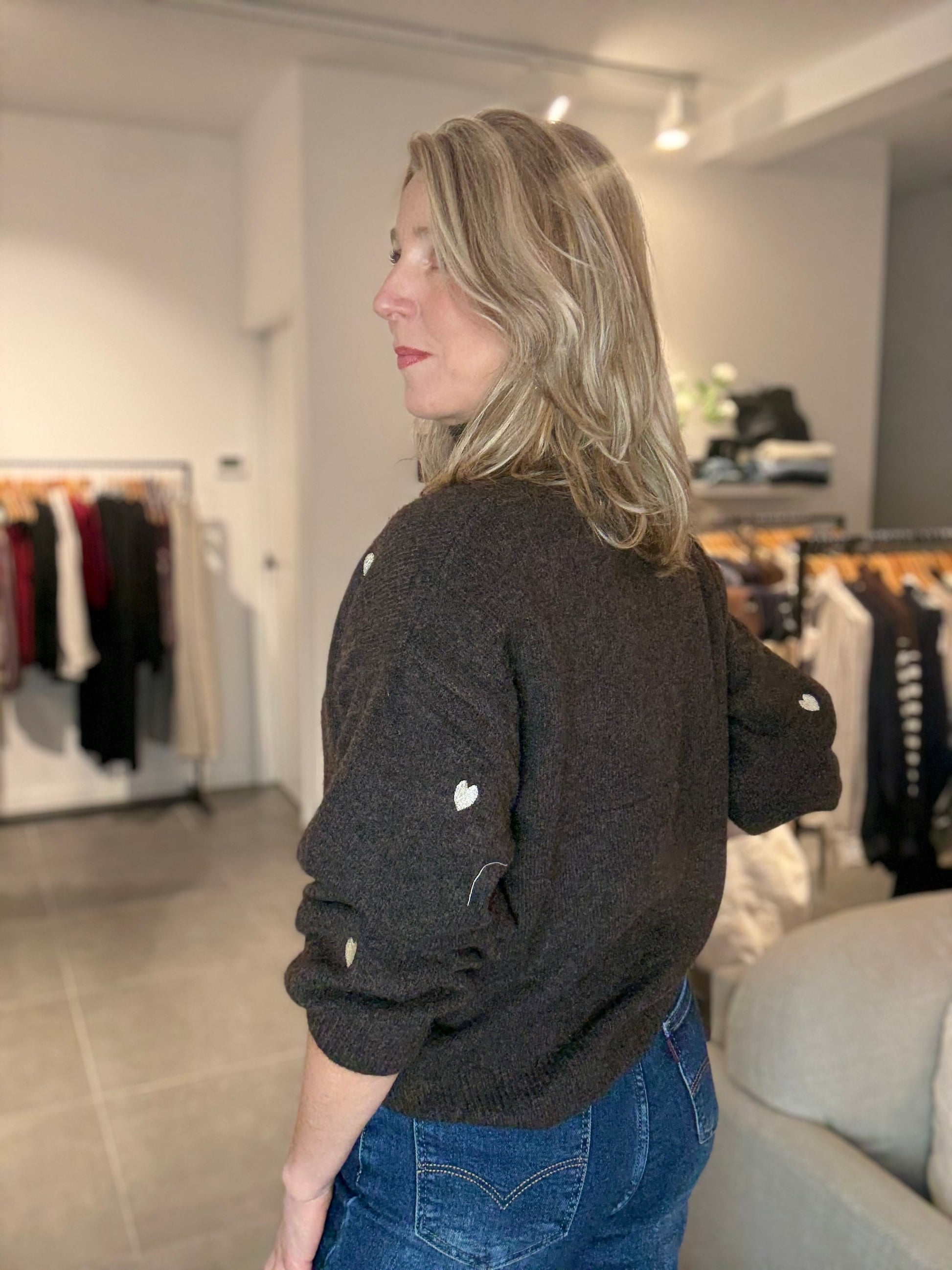 Gebreide trui met zachte en niet te strakke korte col. De trui heeft geborduurde hartjes op het voorpand en de mouwen. Draag deze cosy trui op een jeans voor een casual look. De trui is one size en past mooist tm maat 40. De trui is gemaakt van een mix van polyamide, viscose en een beetje wol.
