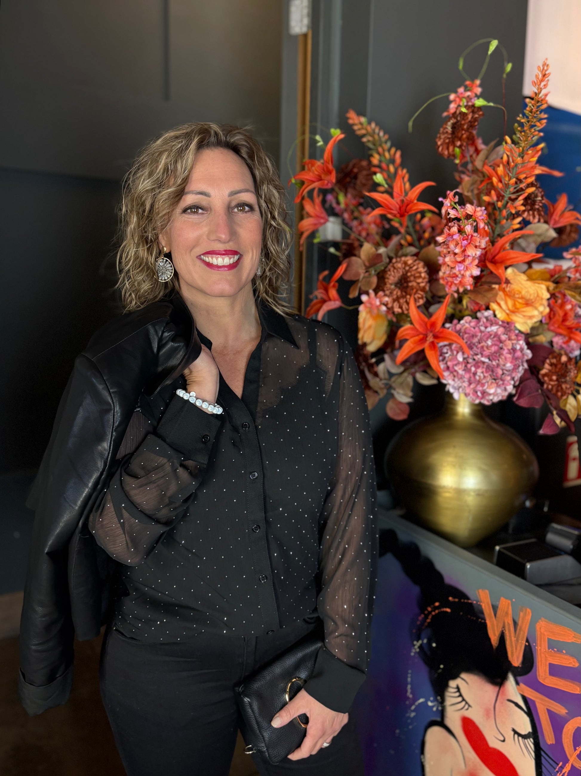 Feestelijke blouse met siersteentjes op de stof. De blouse is licht transparant en heeft lange mouwen en een kraag.