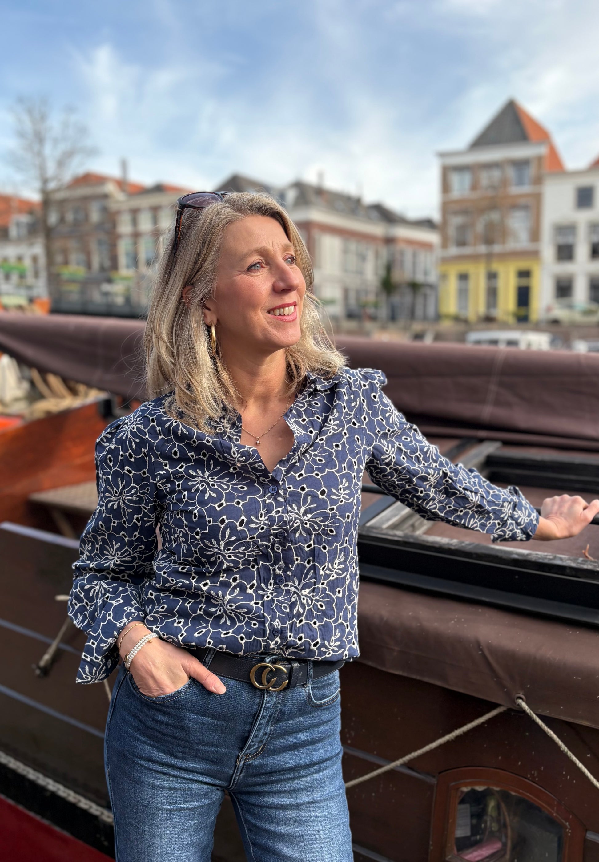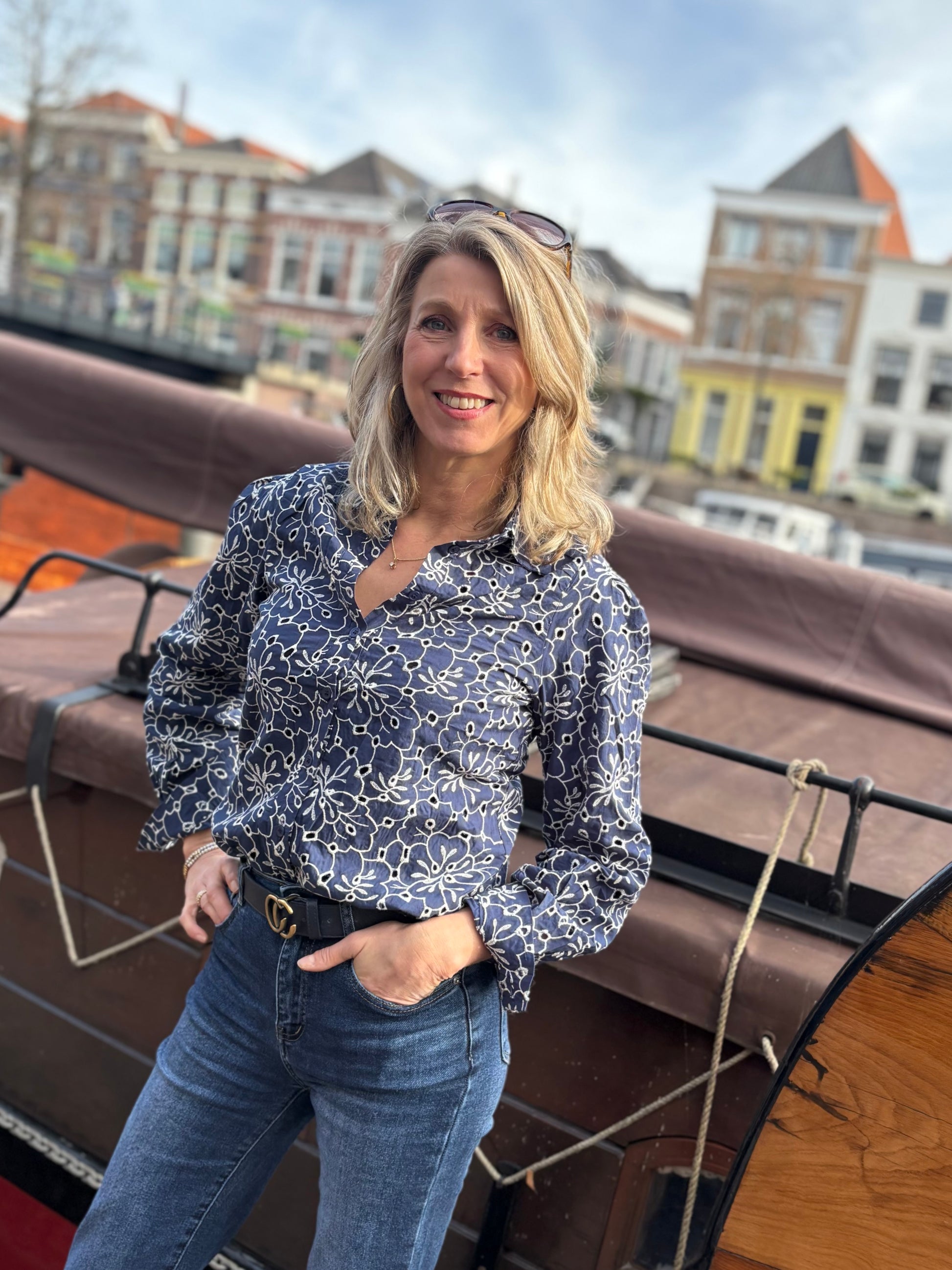 Blouse met kraag en lange mouwen. De blouse is gemaakt van broderiestof met offwhite borduursel in een bloemenpatroon.