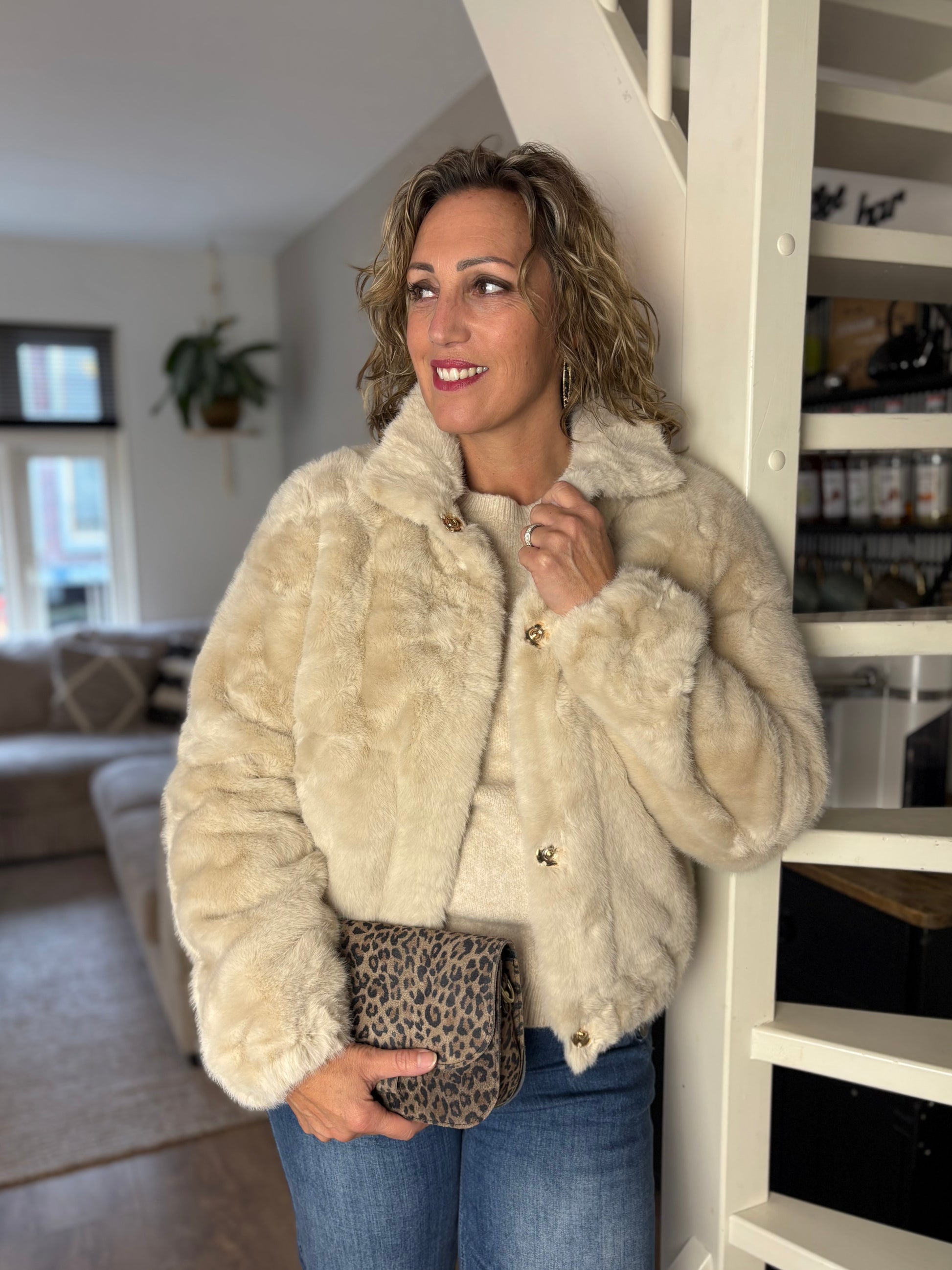 Prachtige jas van imitatiebont. Dit leuke jack is aan 2 kanten draagbaar! Op 1 zijde van de jas zitten steekzakken. De manchetten zijn elastisch. De jas sluit met drukkers.