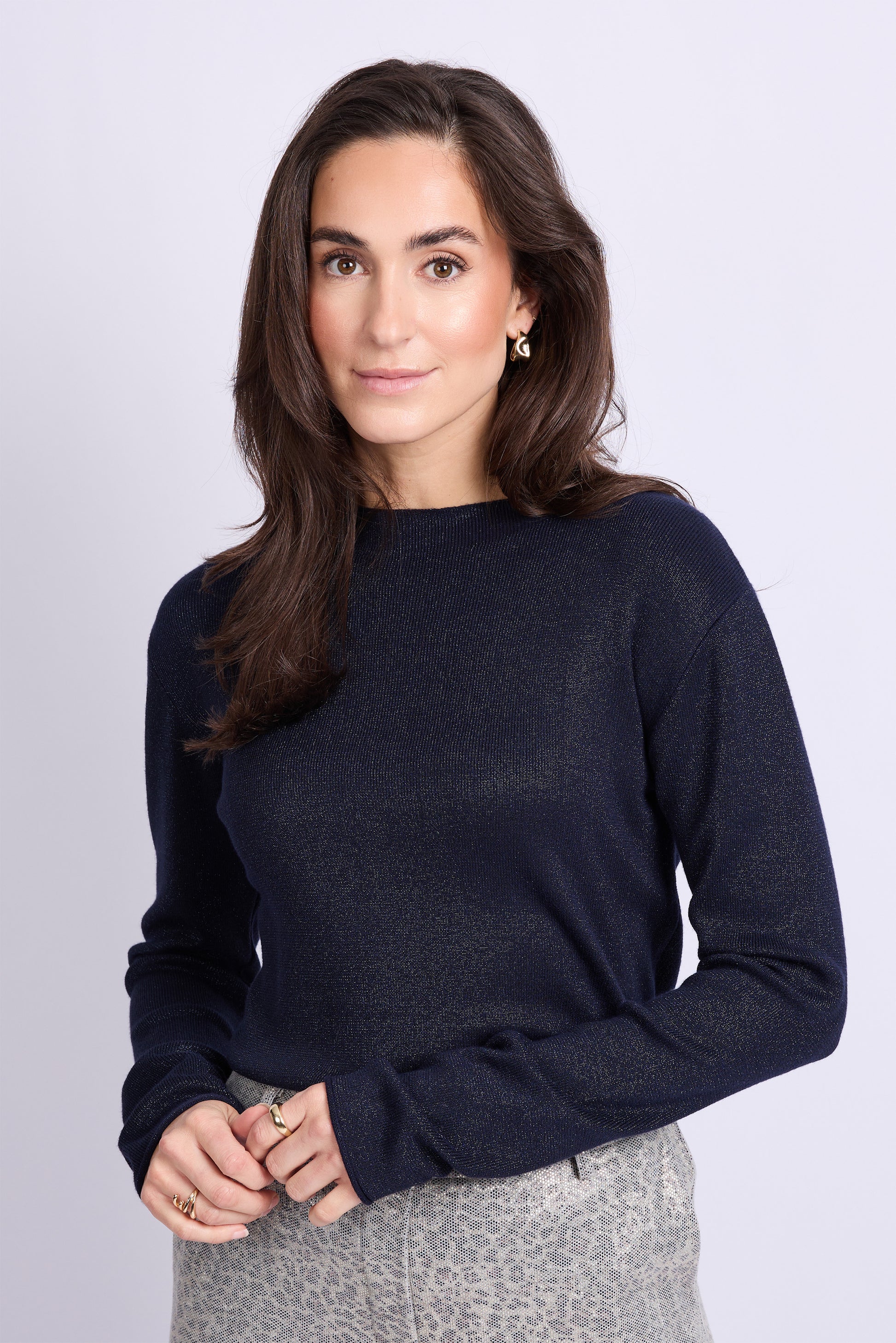 Dunne gebreide trui met een iets opstaande halsrand, lange mouwen en aangerimpeld in de zijnaden en onderaan de mouwen. In de stof zit heel subtiel een glittertje verwerkt. Echt een mooi basistruitje.