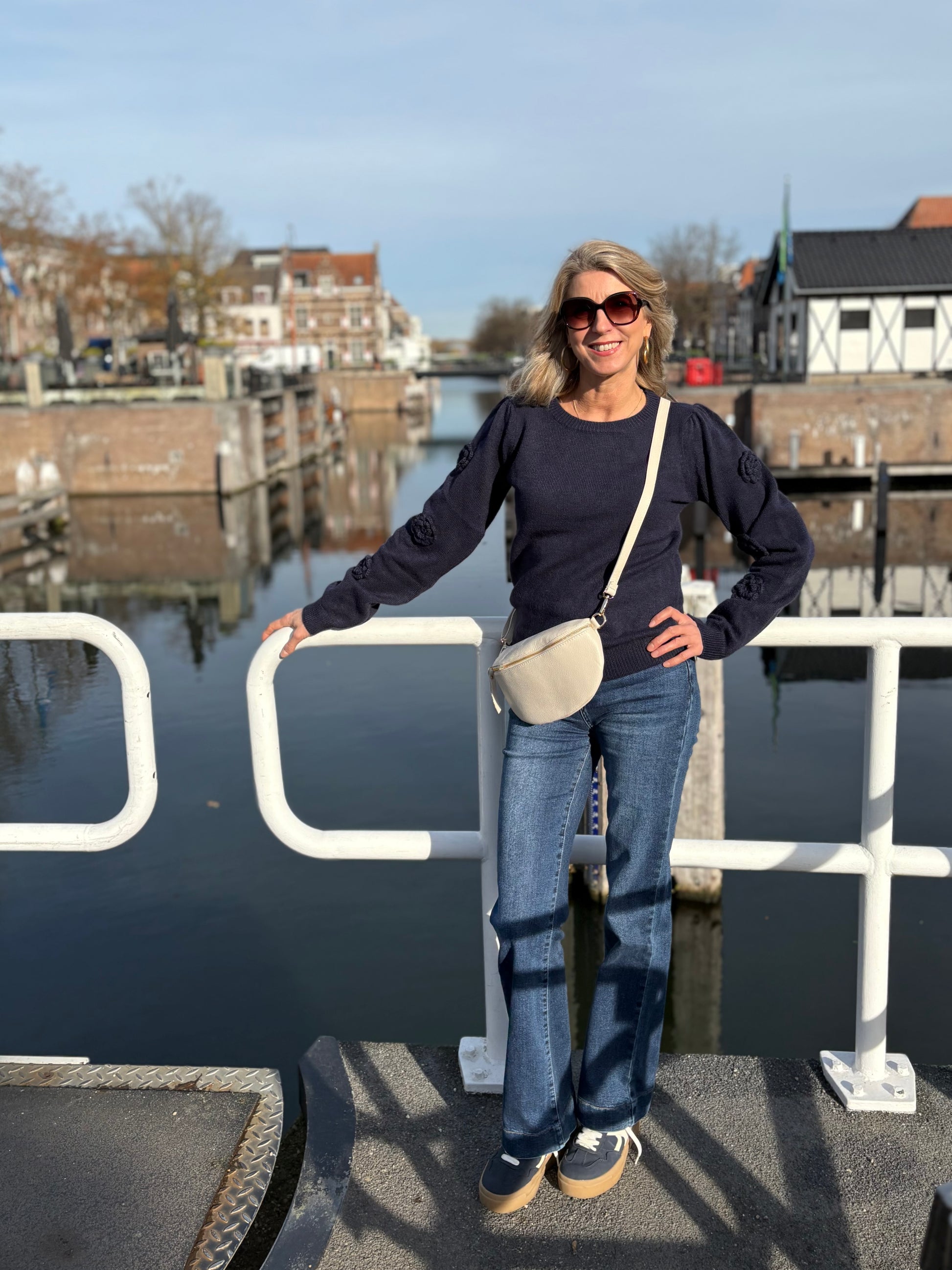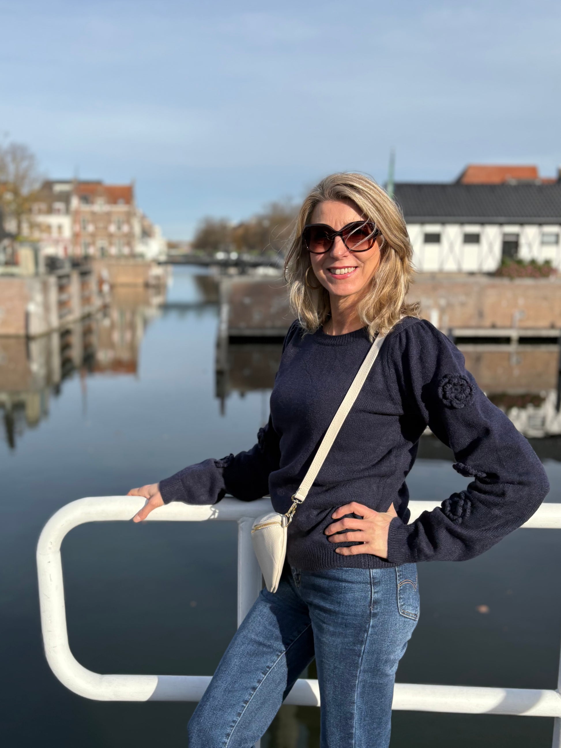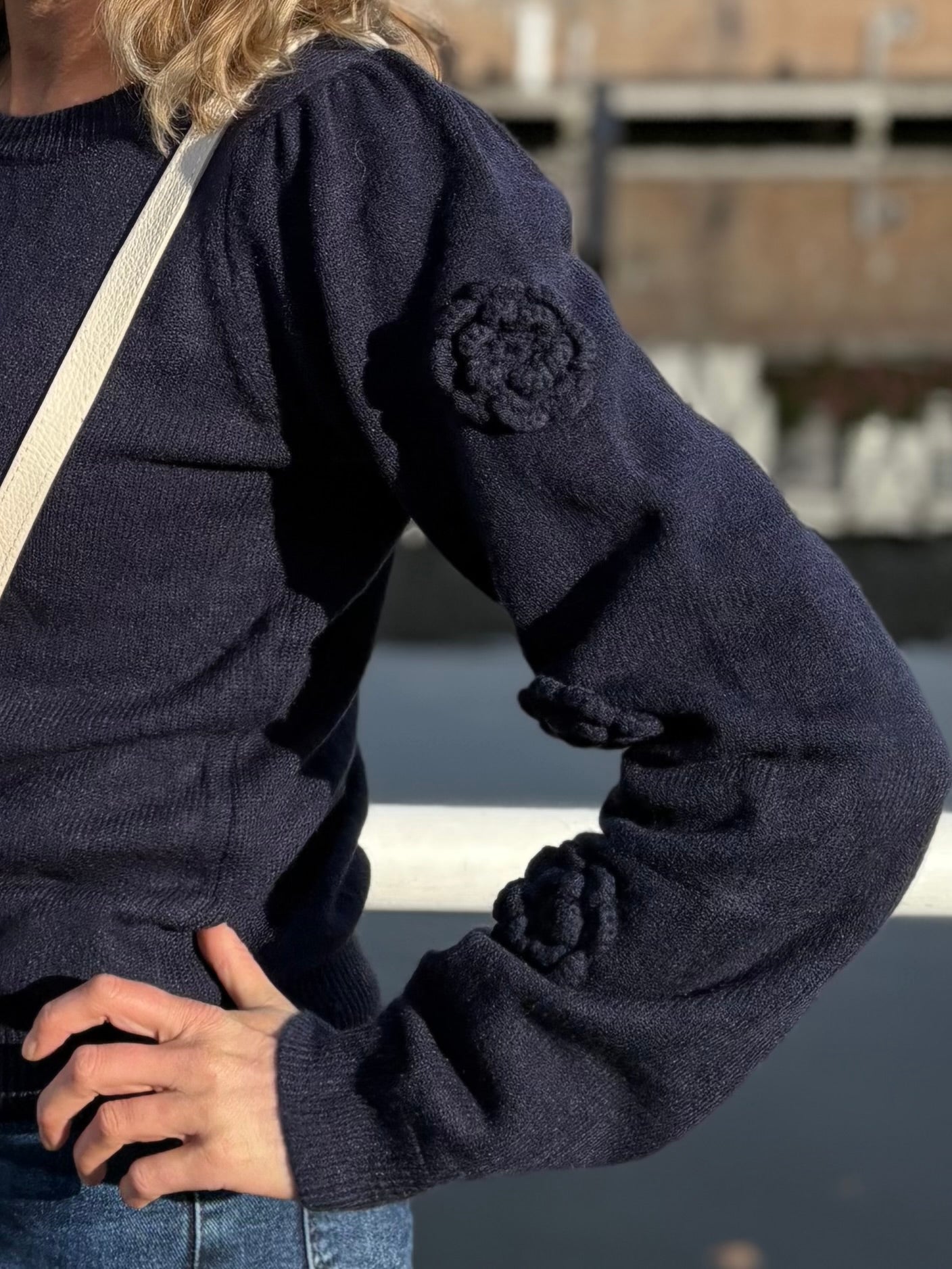 Leuke trui met gebreide rozen op de mouwen. De trui heeft pofmouwen en een ronde hals. De trui is verkrijgbaar in 3 maten en valt op maat. Het breisel is gemaakt van een mix van acryl, polyester en polyamide. Dus ideaal als je niet zo goed tegen wol kunt.