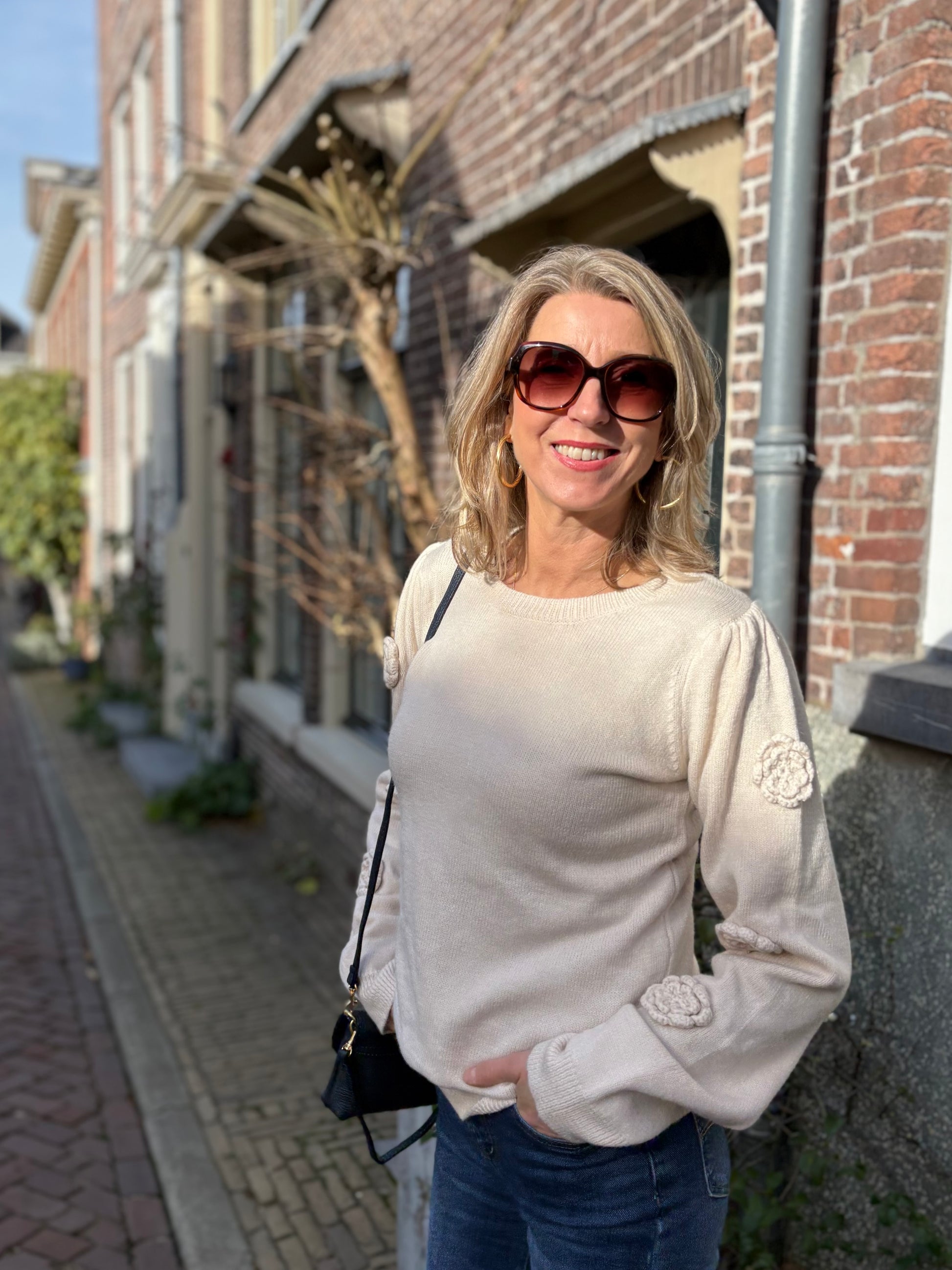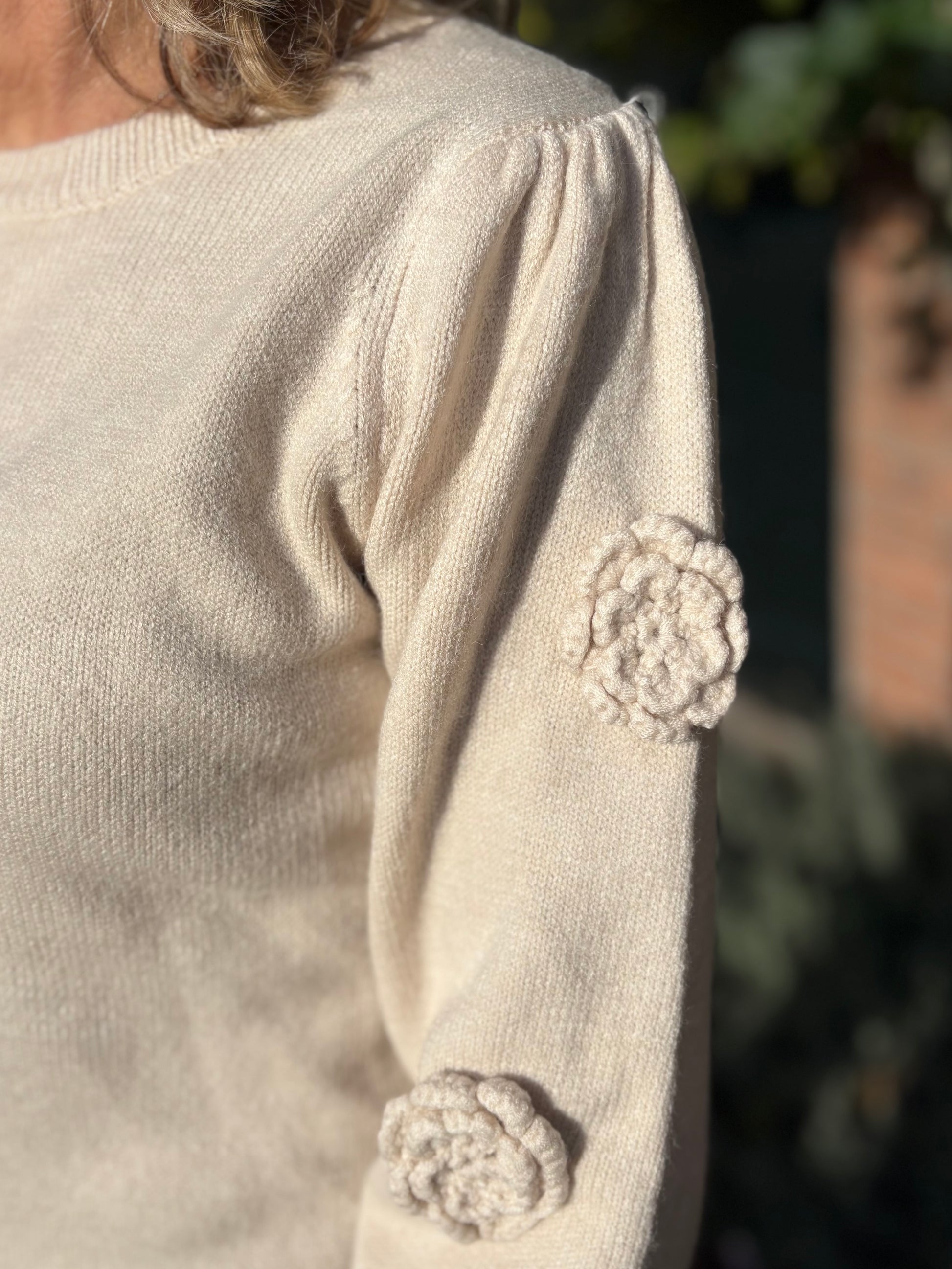 Leuke trui met gebreide rozen op de mouwen. De trui heeft pofmouwen en een ronde hals. De trui is verkrijgbaar in 3 maten en valt op maat. Het breisel is gemaakt van polyester, acryl en polyamide. Ideaal dus als je niet goed tegen wol kunt.