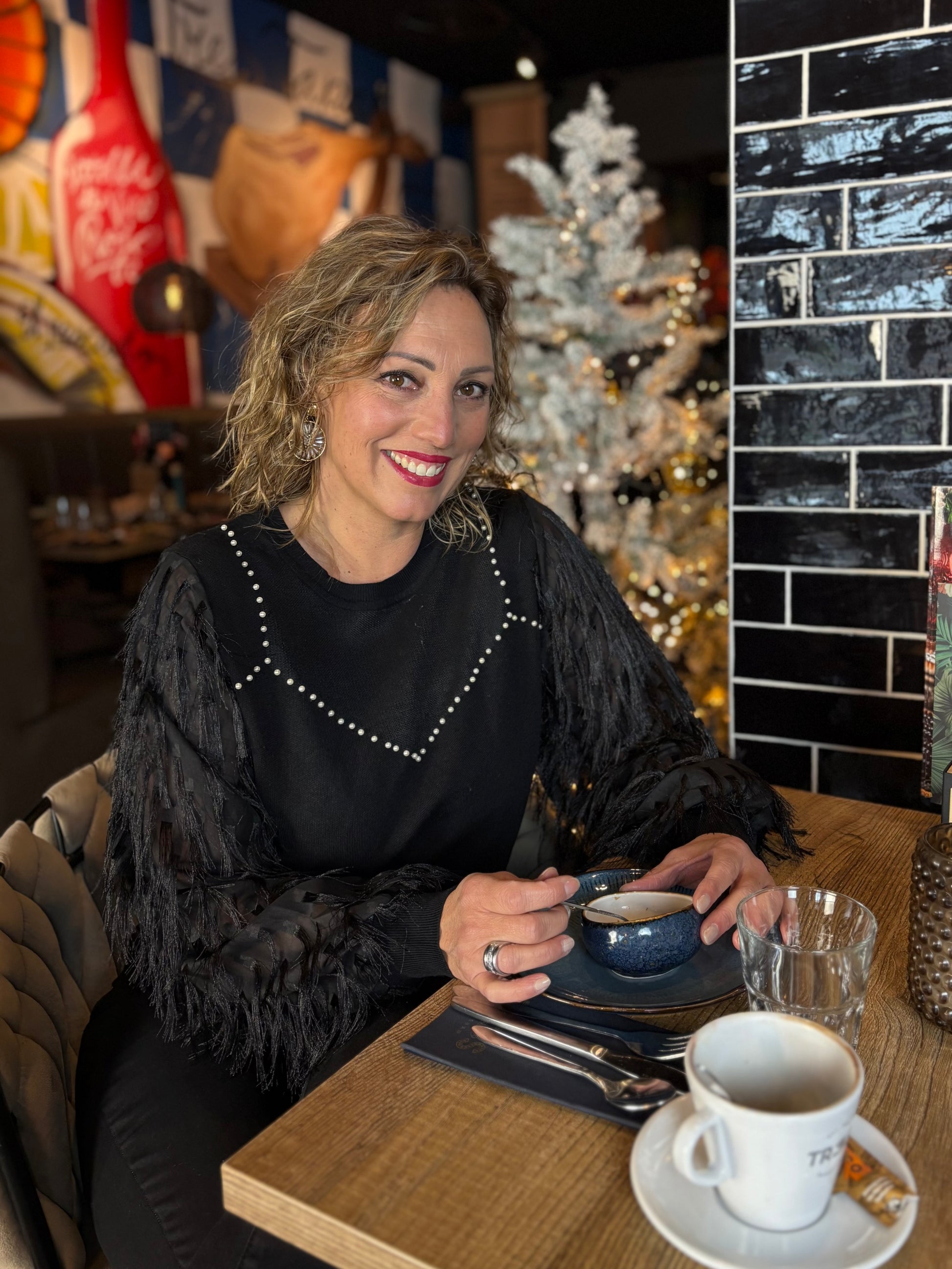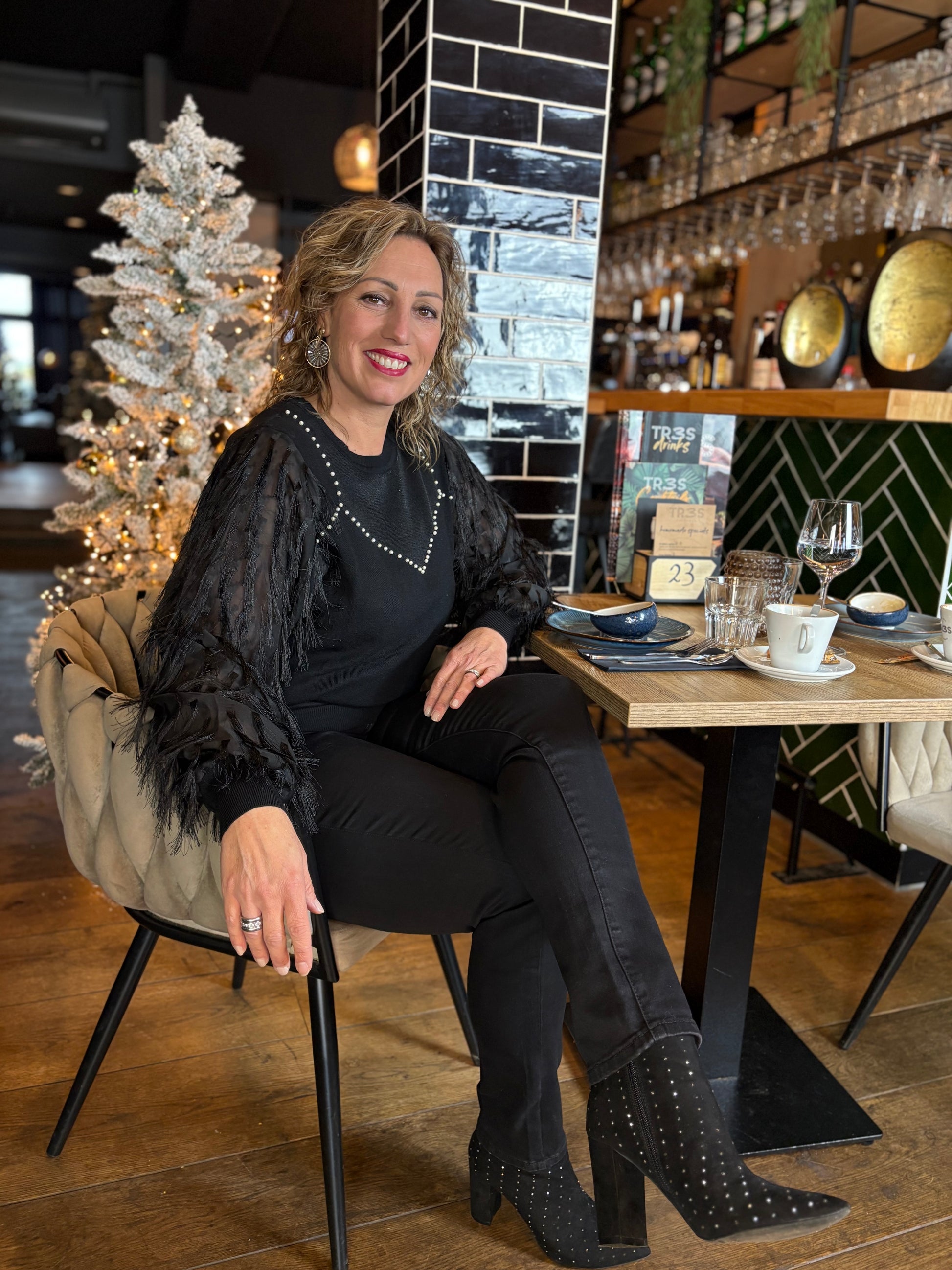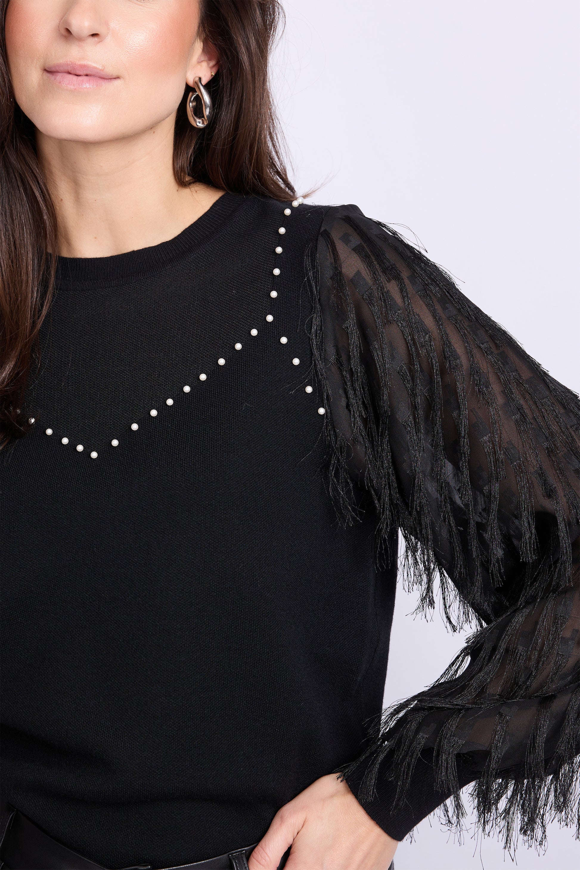 Trui met pareltjes op het voorpand en glanzende draadjes langs de transparante mouwen. Een echte eyecatcher! Stoer en feestelijk tegelijk.