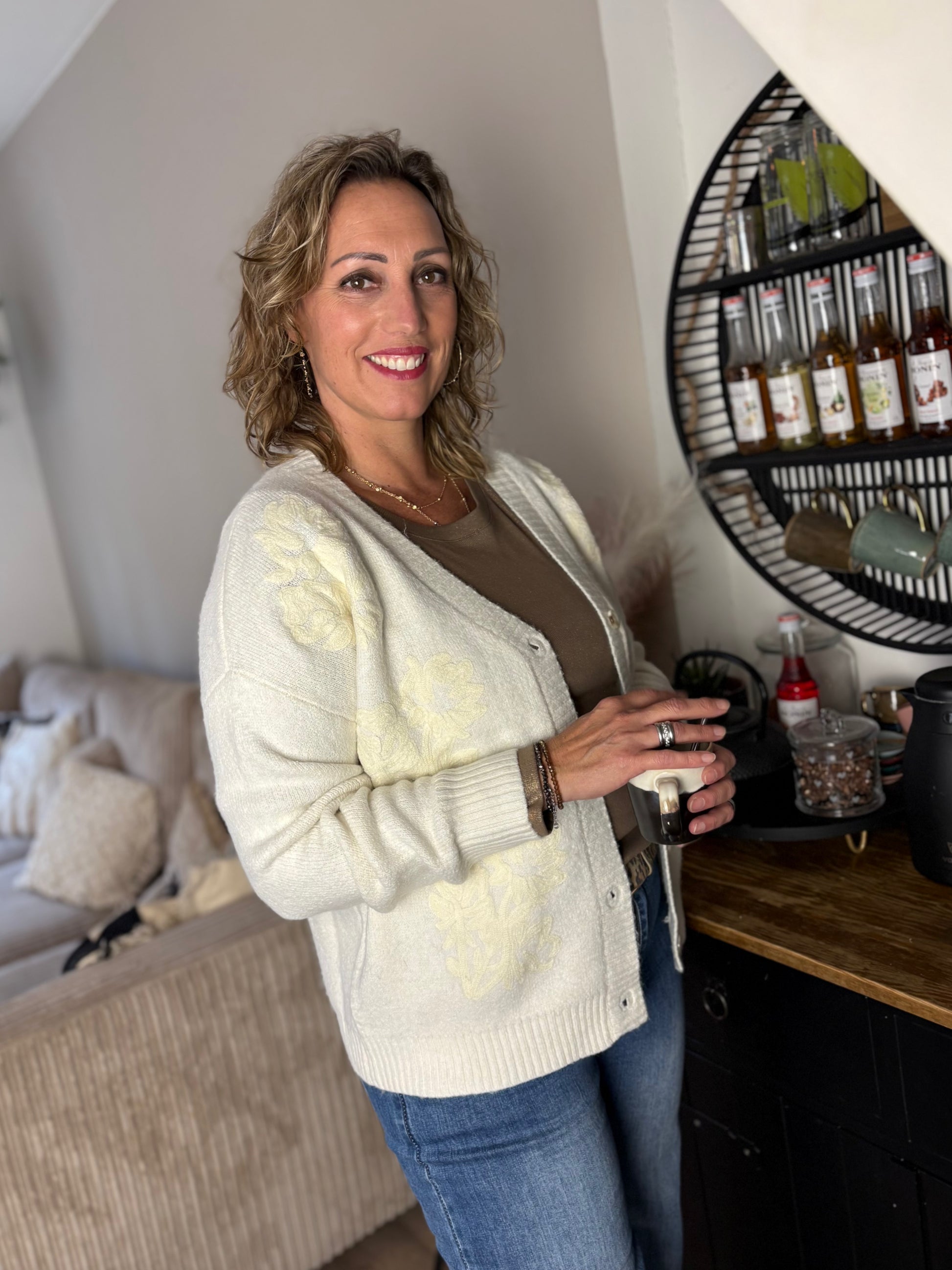 Gebreid vest met geborduurde bloemen op het voorpand.