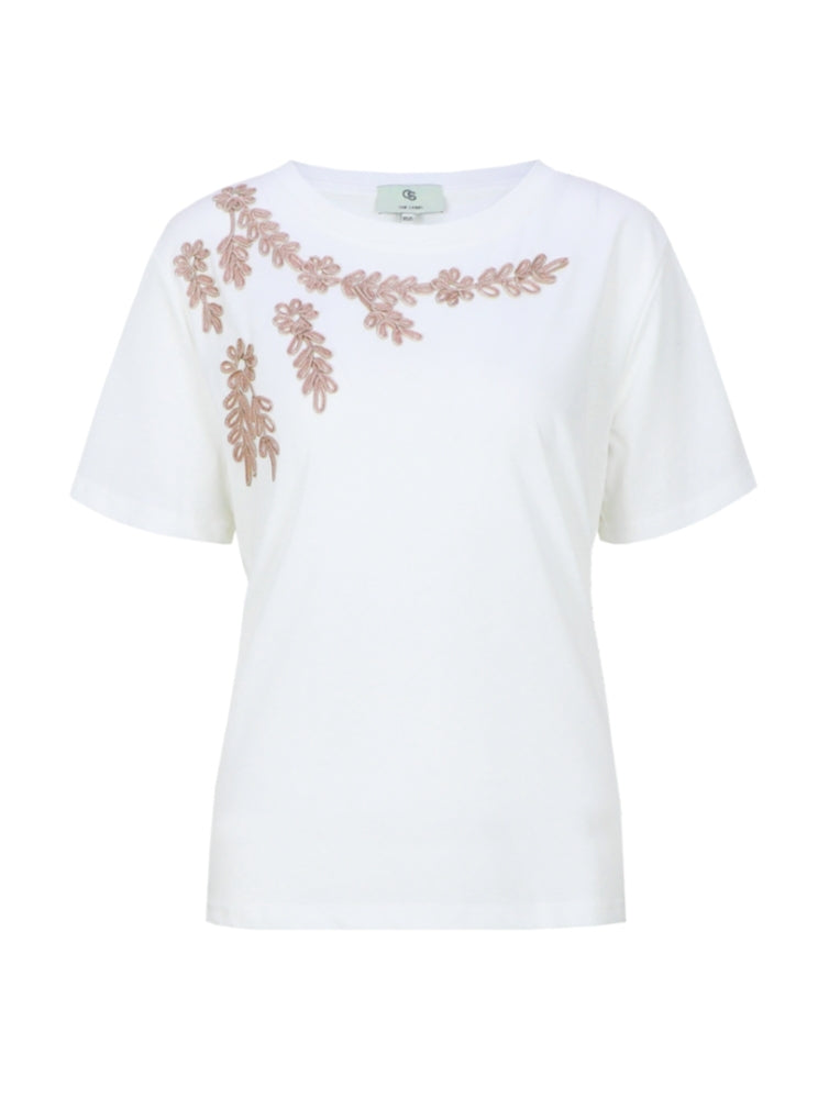 T-shirt met korte mouwen en ronde hals en leuk borduursel in de kleur hazelnoot passend bij de broeken uit de voorjaarscollectie van CS The Label.
