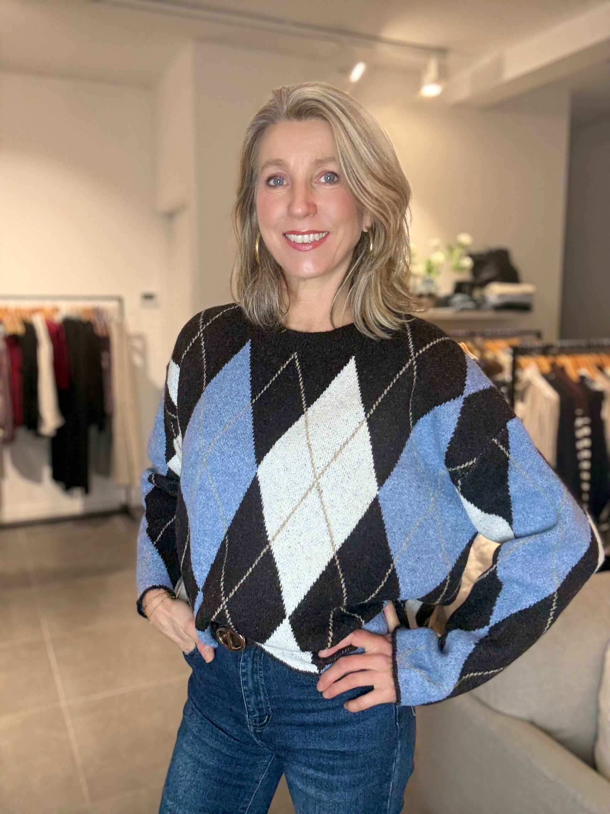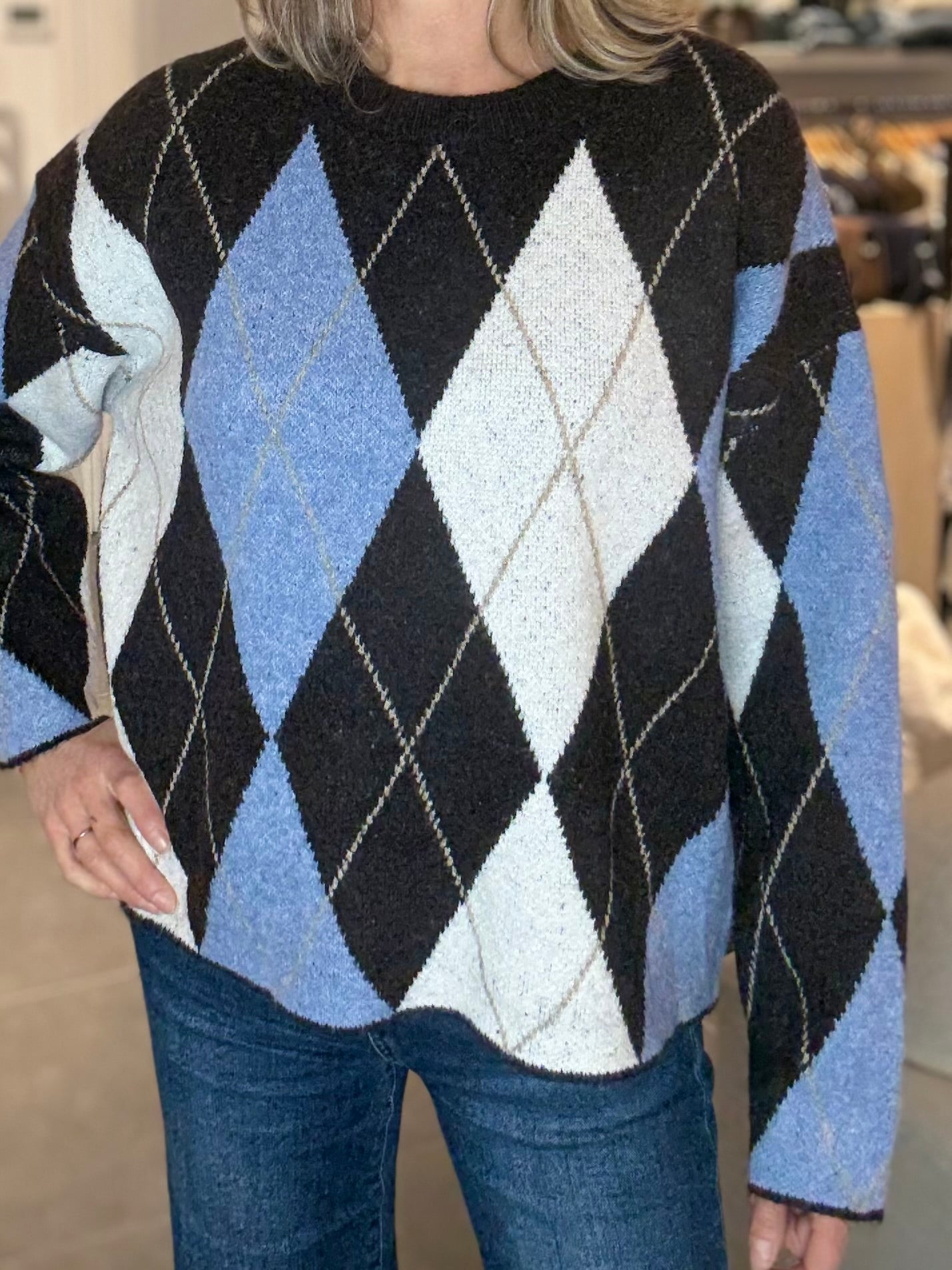 De trend van nu! Trui met groot ruitpatroon. De trui heeft lange mouwen zonder manchetten en geen onderboord. De trui heeft een ronde hals. Deze trui is one size en past het mooist bij maat 38 tm 42.