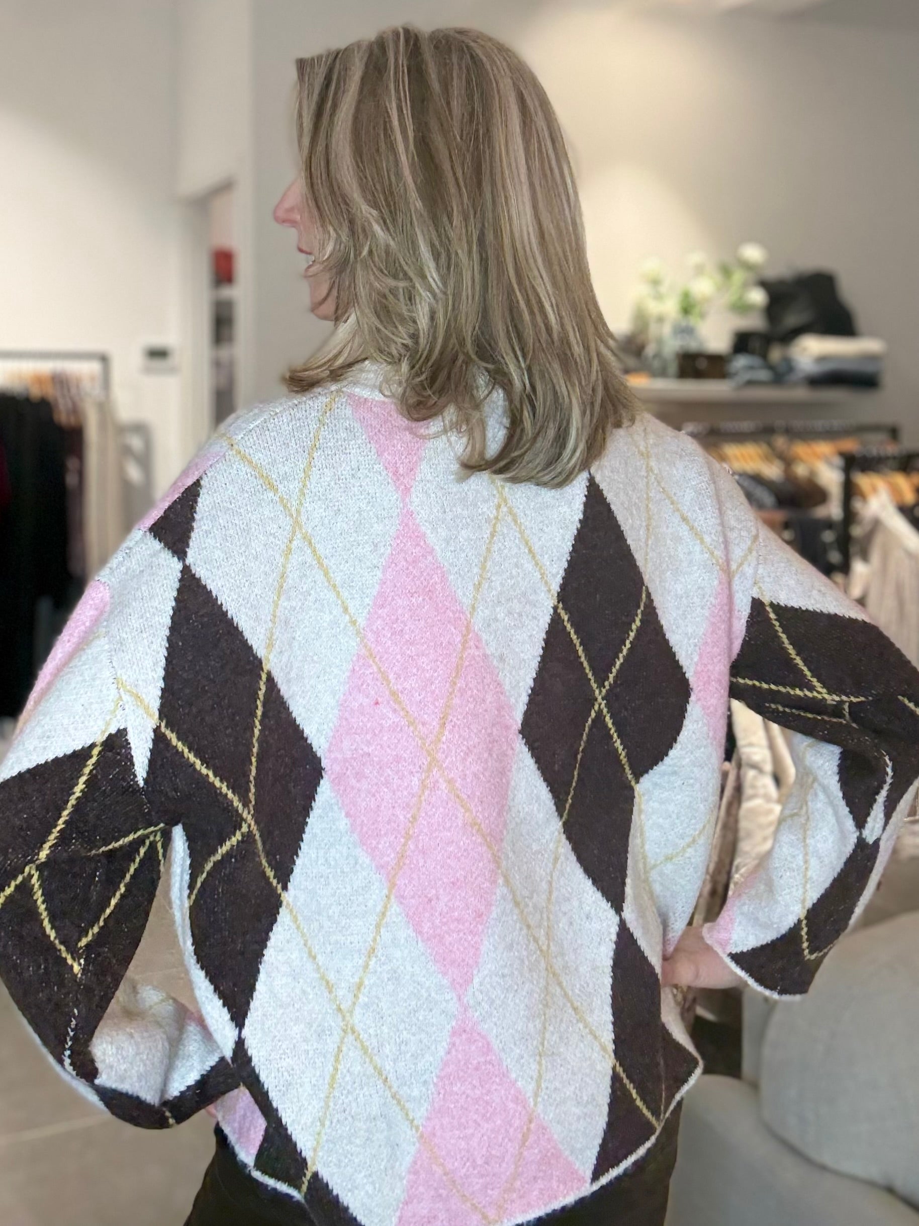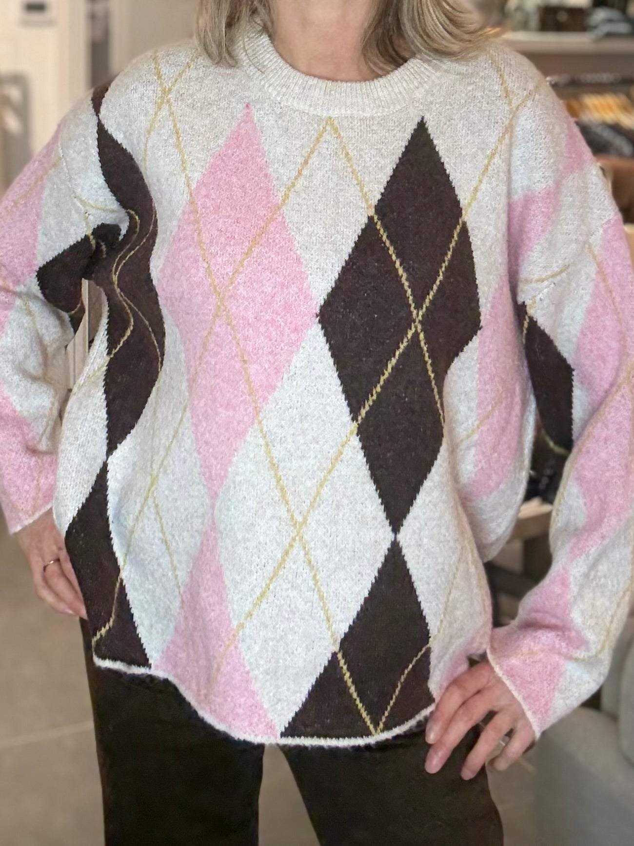 De trend van nu! Trui met groot ruitpatroon. De trui heeft lange mouwen zonder manchetten en geen onderboord. De trui heeft een ronde hals. Deze trui is one size en valt ruim. Past het mooist bij maat 38 tm 42.