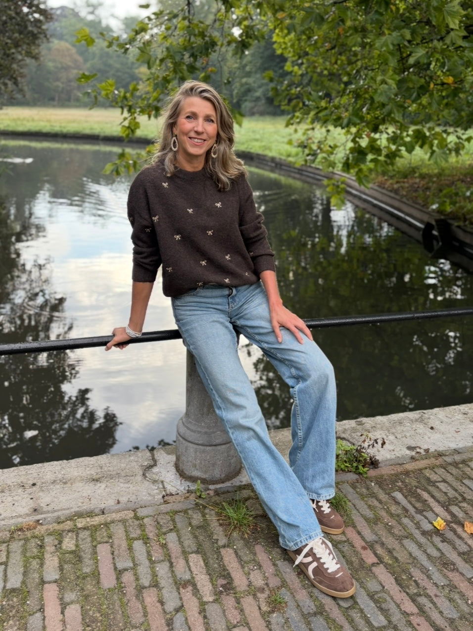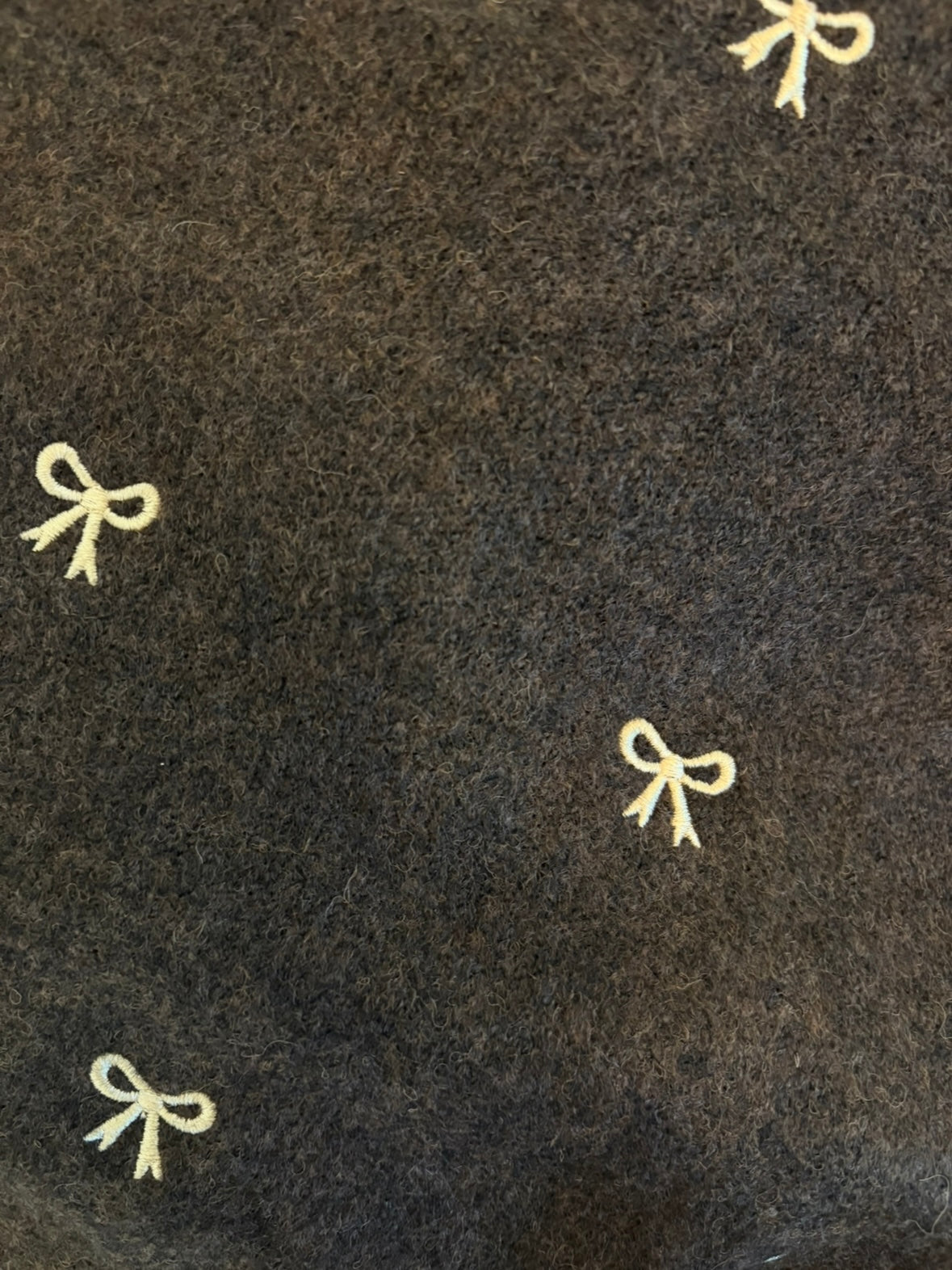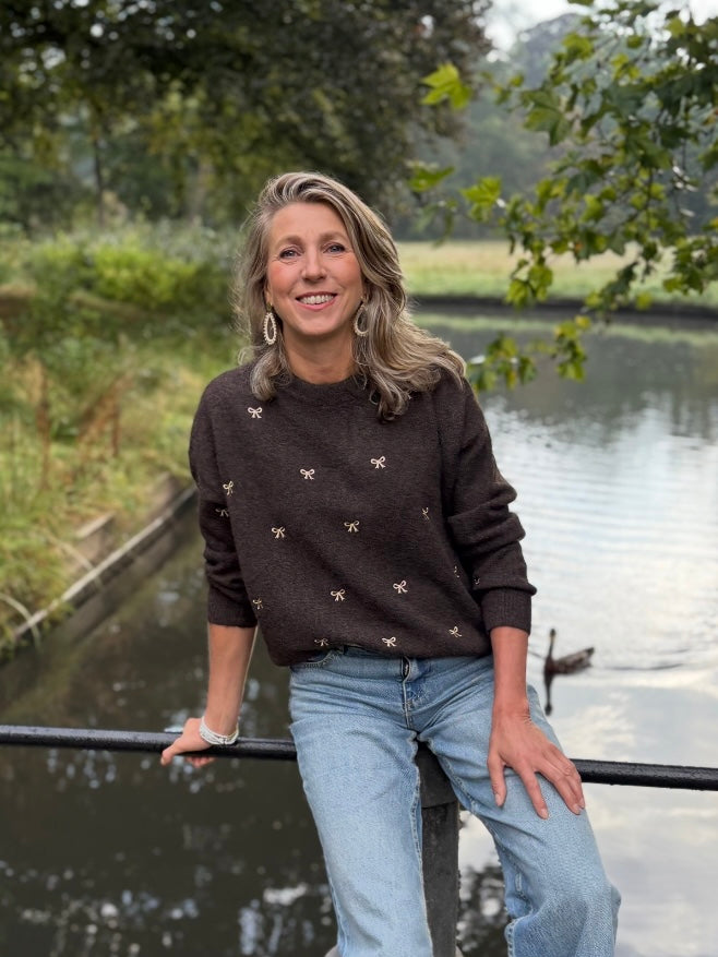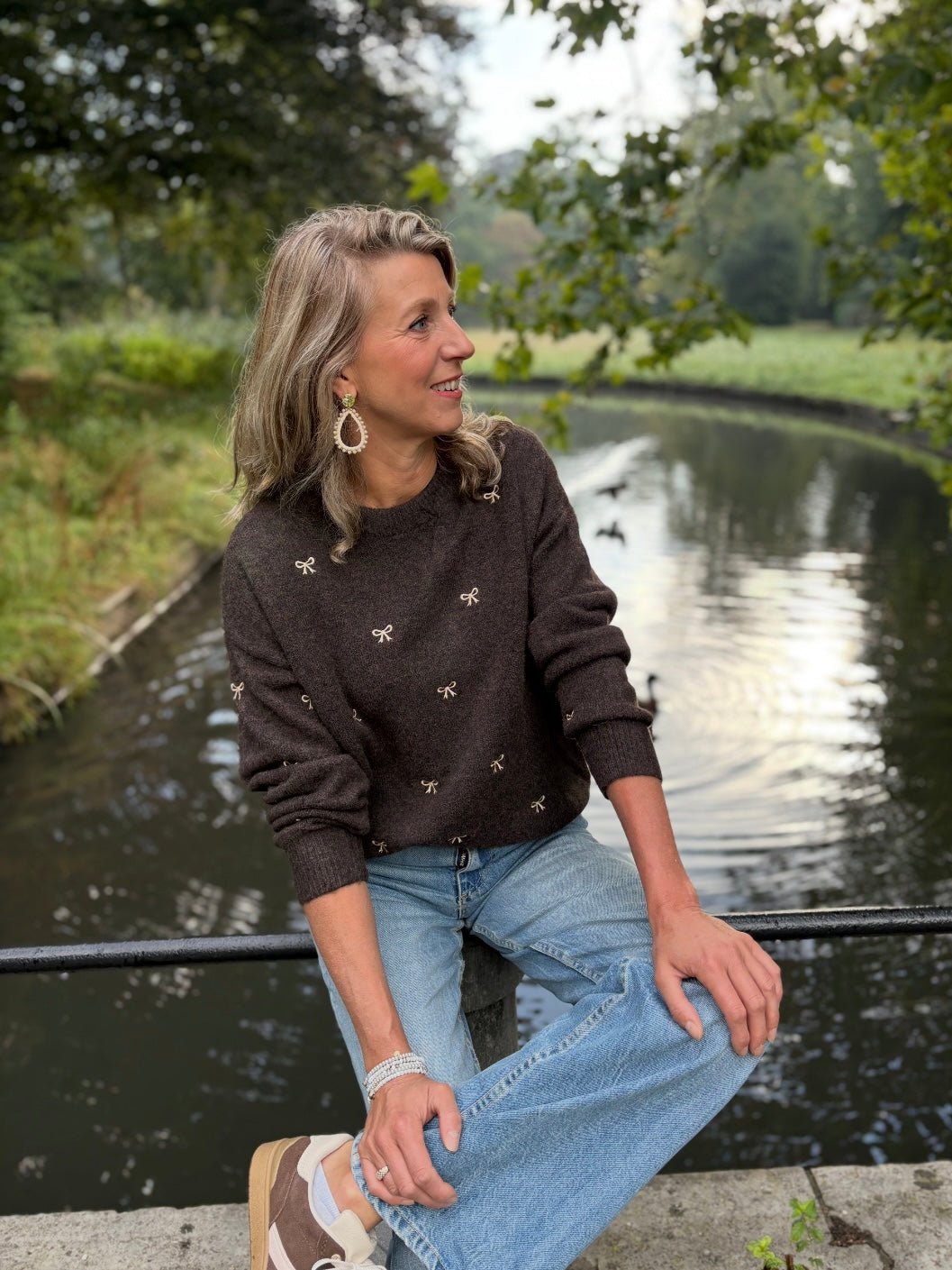 Zachte gebreide trui met geborduurde strikjes op voorpand en mouwen.