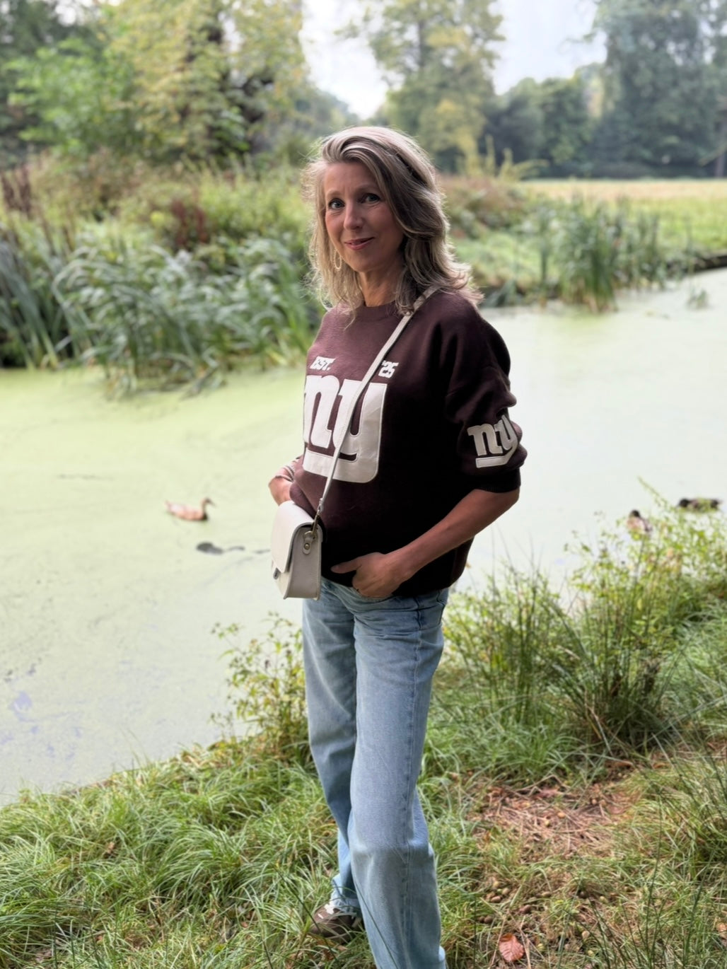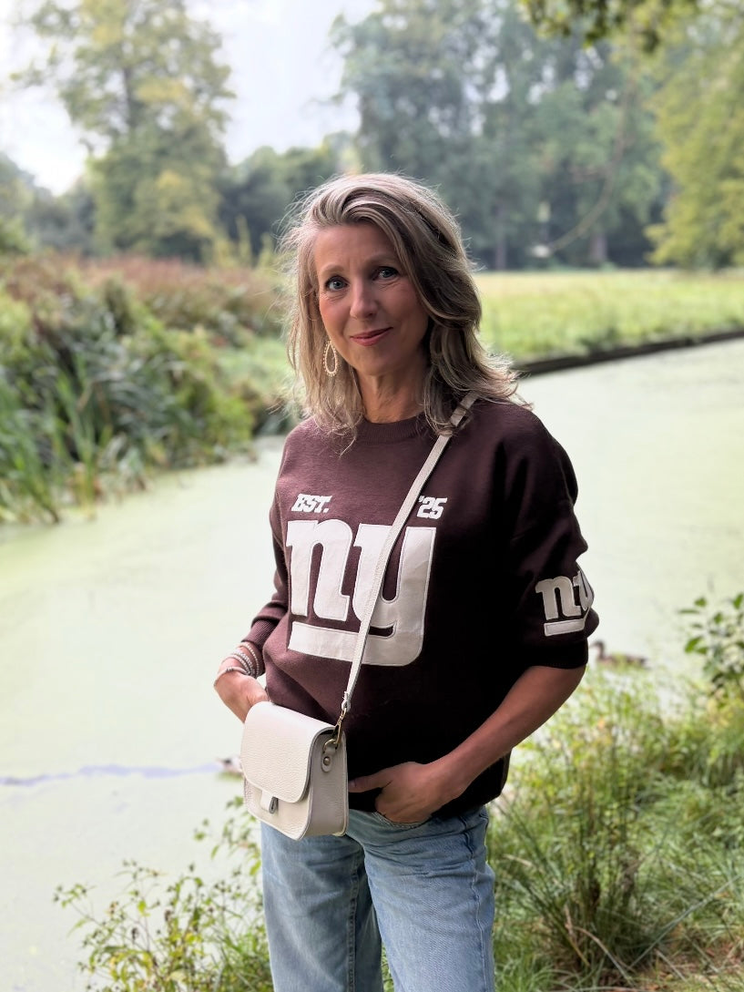 Zachte trui met tekst in suedine/borduursel. De trui heeft lange mouwen en een ronde hals.