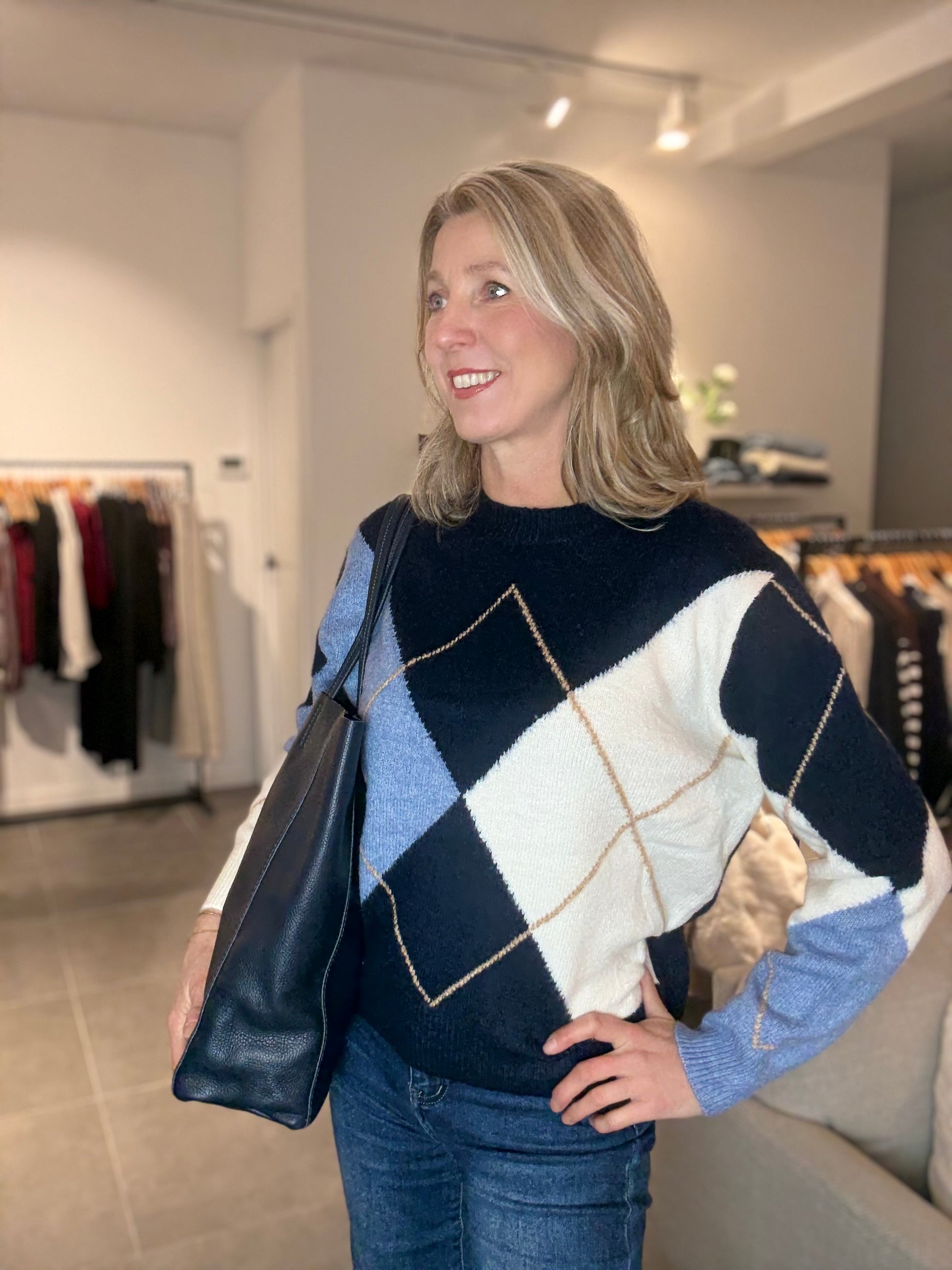 Met een knipoog naar een klassieker: de trui met ruit. Deze trui heeft een groot ingebreid ruitpatroon en een ronde hals. Lekker warm en stoer op een jeans of blauwe pantalon. De trui is one size en past tm maat 42. Materiaal is een mix van polyamide, viscose en een beetje wol.