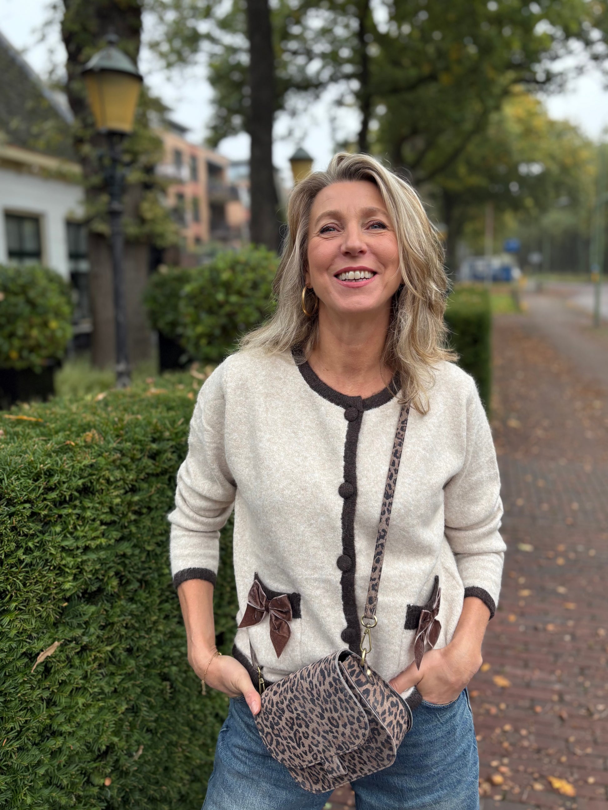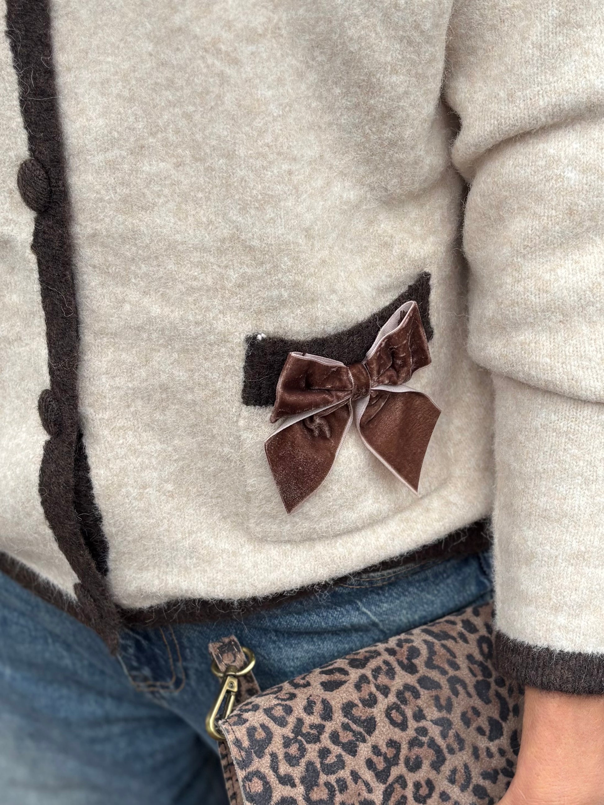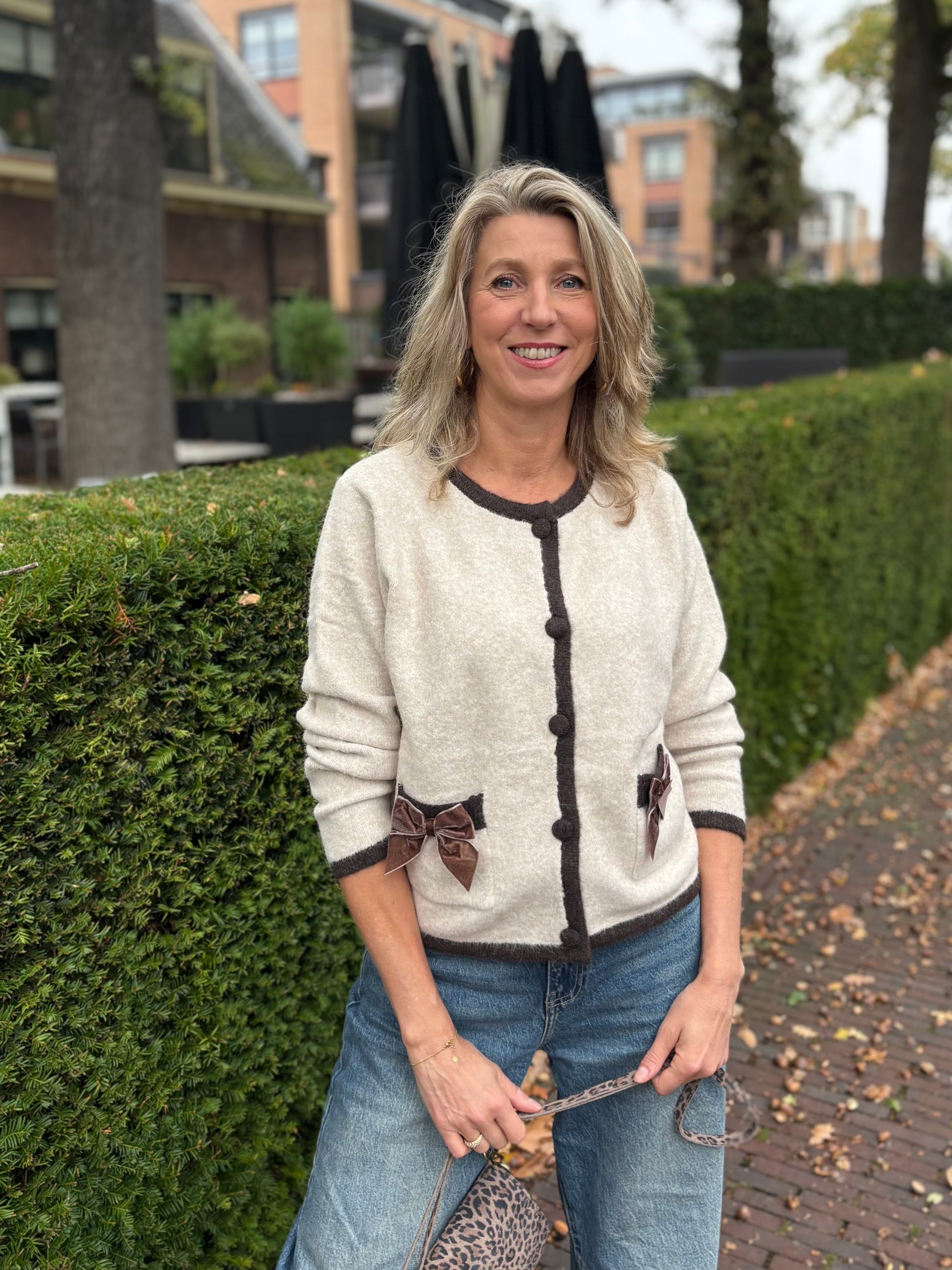 Charmant vest met fluwelen strikjes op de zakjes op het voorpand. Het vest heeft gestoffeerde knopen.