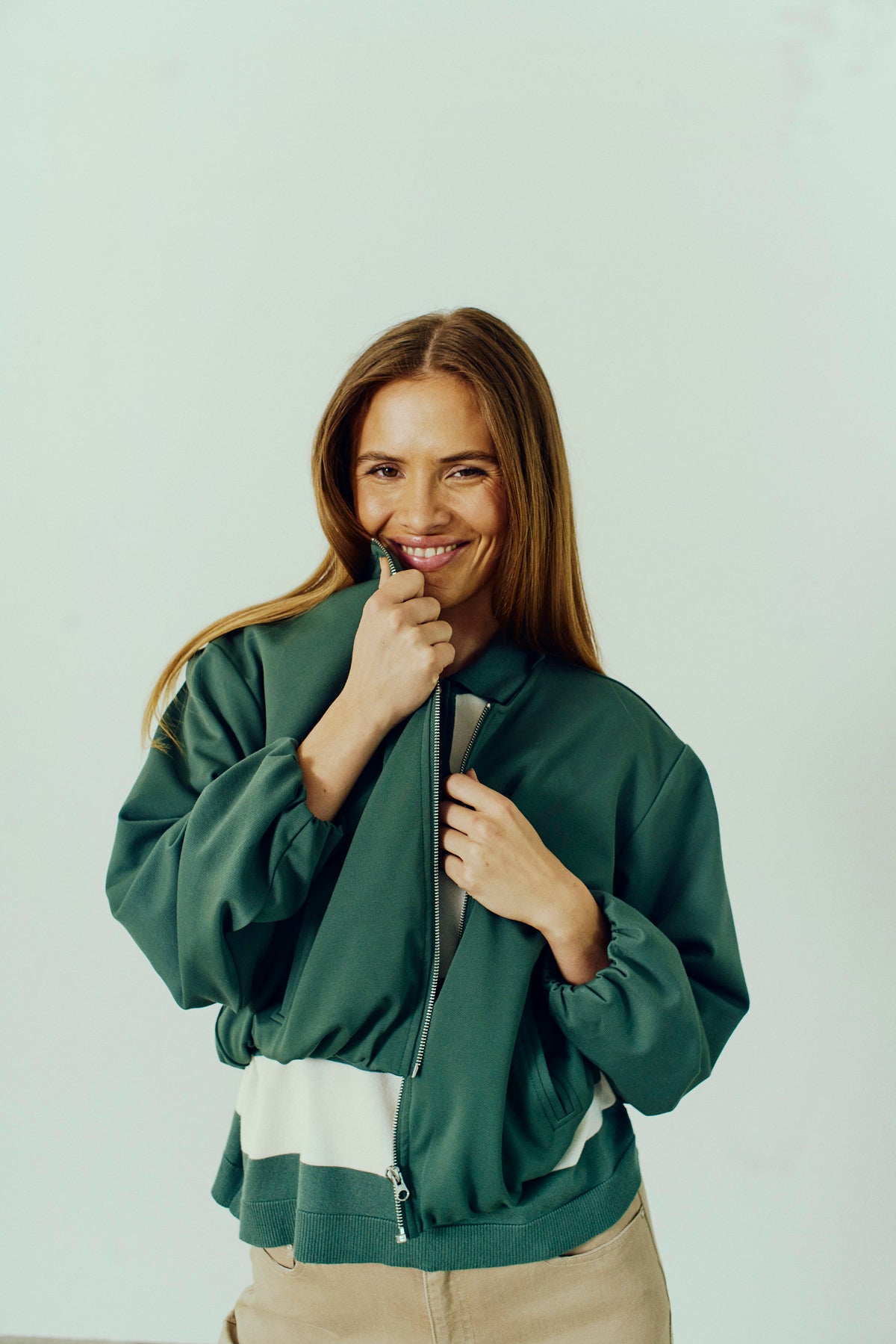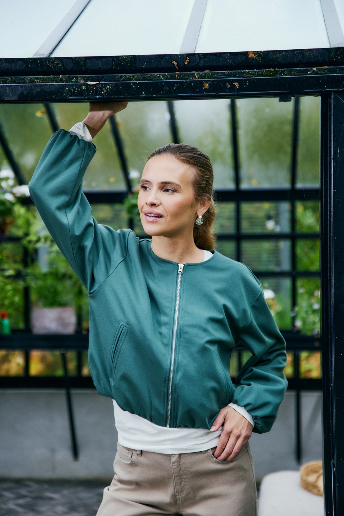 Bomberjasje zonder kraag. Het jasje heeft een elastische onderboord en is gevoerd. Op het voorpand zitten steekzakjes. Het jack sluit met een rits. Bijpassende broek Nanni verkrijgbaar. Leuk dus als modern pak te dragen of style dit jack met een stoer T-shirt op een mooie jeans. Het jasje valt ruim.