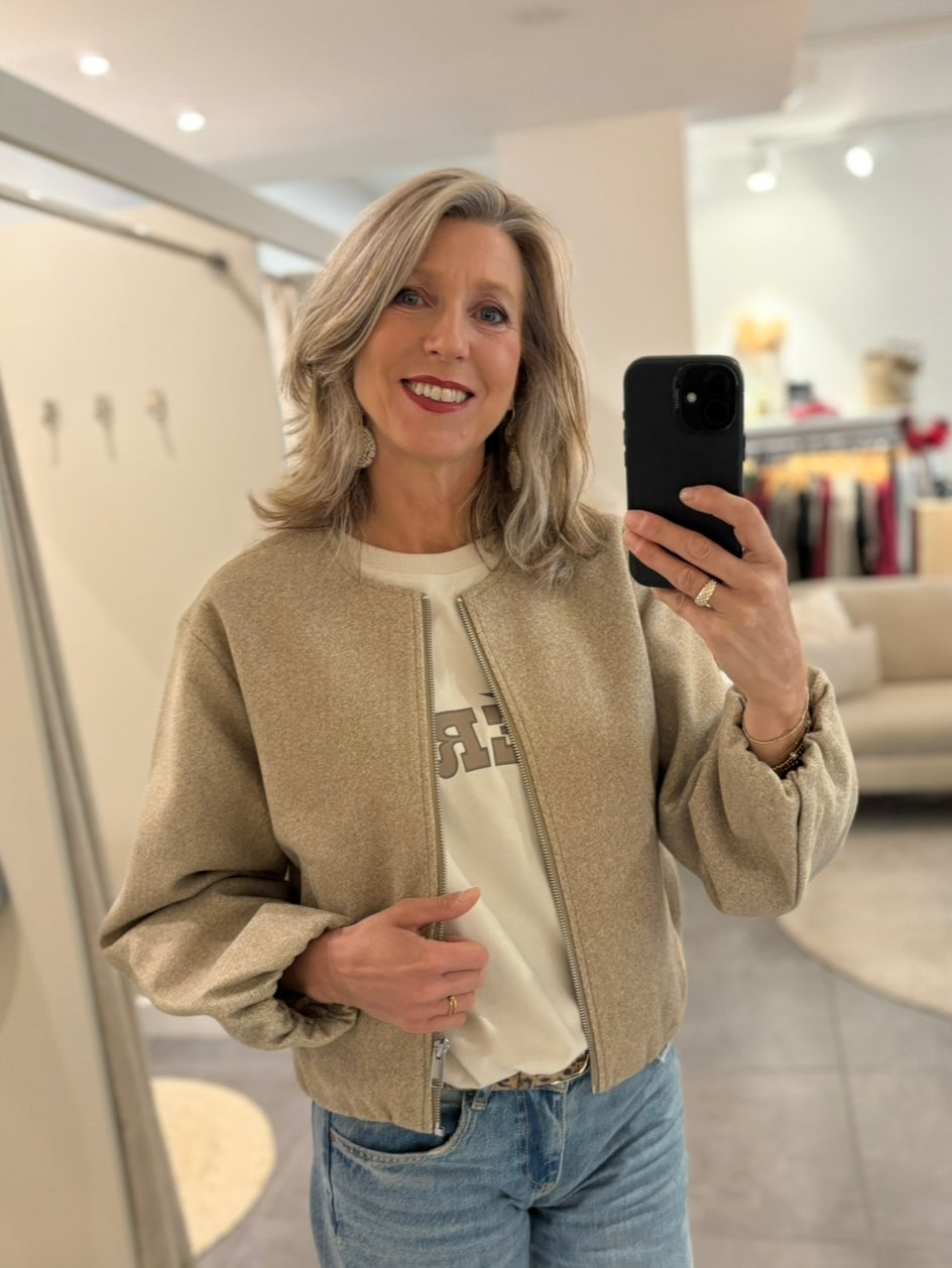 Bomberjasje met elastische onderboord en ballonmouwen met elastische manchetten. Het jack heeft een ritssluiting en steekzakken. De stof heeft de uitstraling van wol.