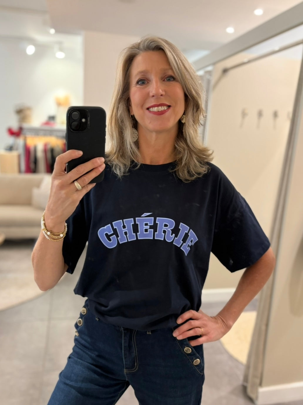 T-shirt met met opdruk Cherie. Het shirt heeft een onderboord en valt enigszins bloezend.