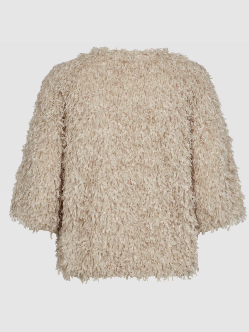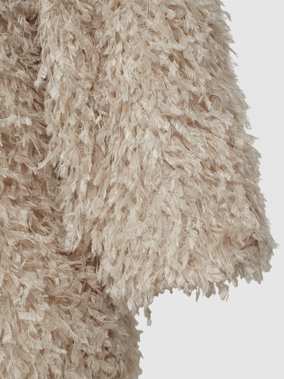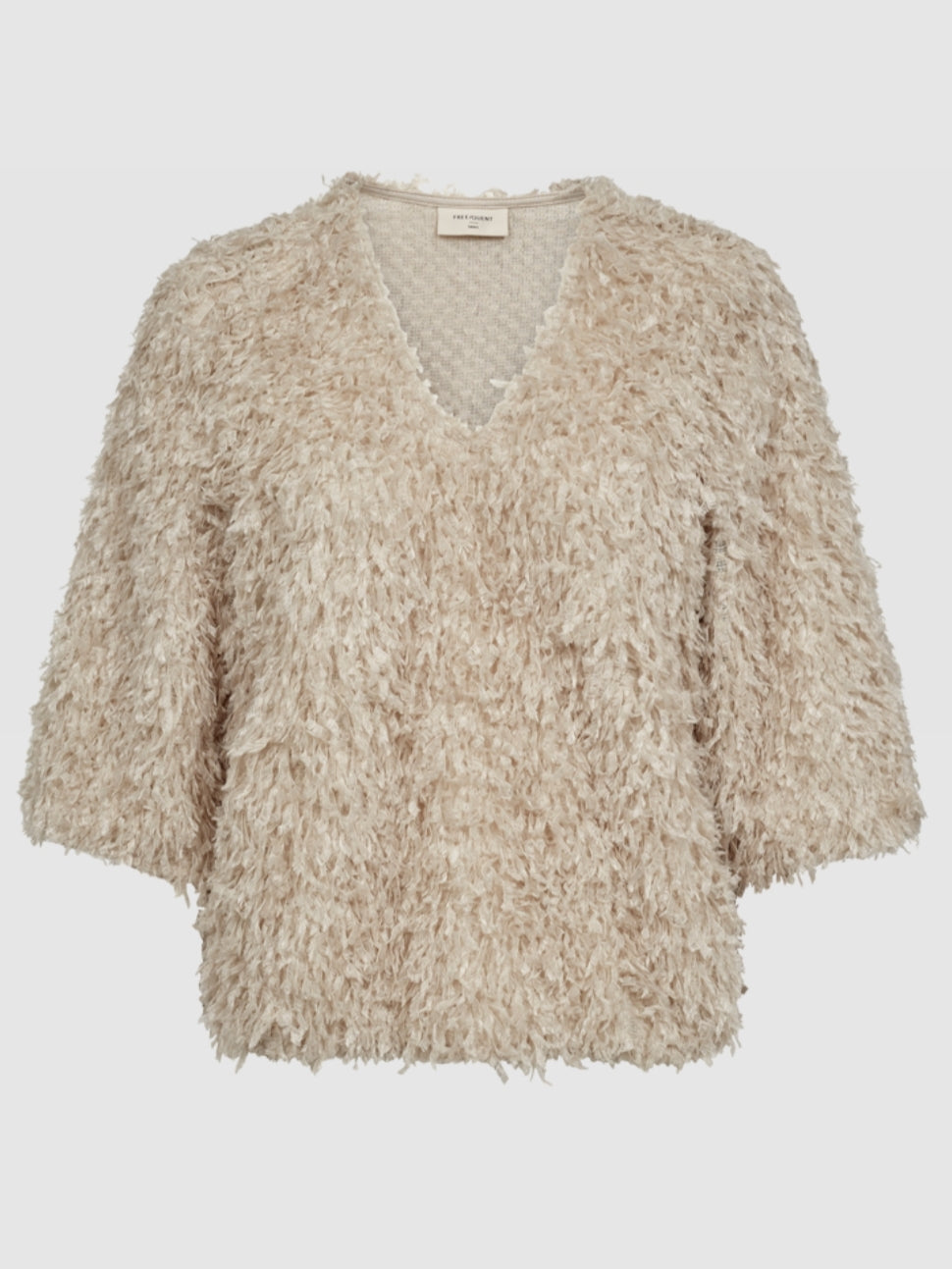 Top met V-hals en mouw tot net over de elleboog. De top is een echte eyecatcher door de fluffly 'veertjes' die op de stof zijn verwerkt.