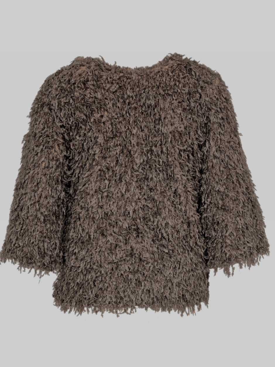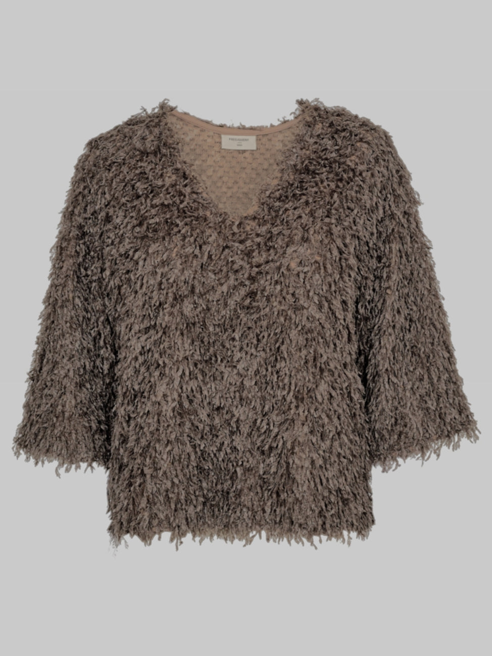 Top met V-hals en mouw tot net over de elleboog. De top is een echte eyecatcher door de fluffly 'veertjes' die op de stof zijn verwerkt.