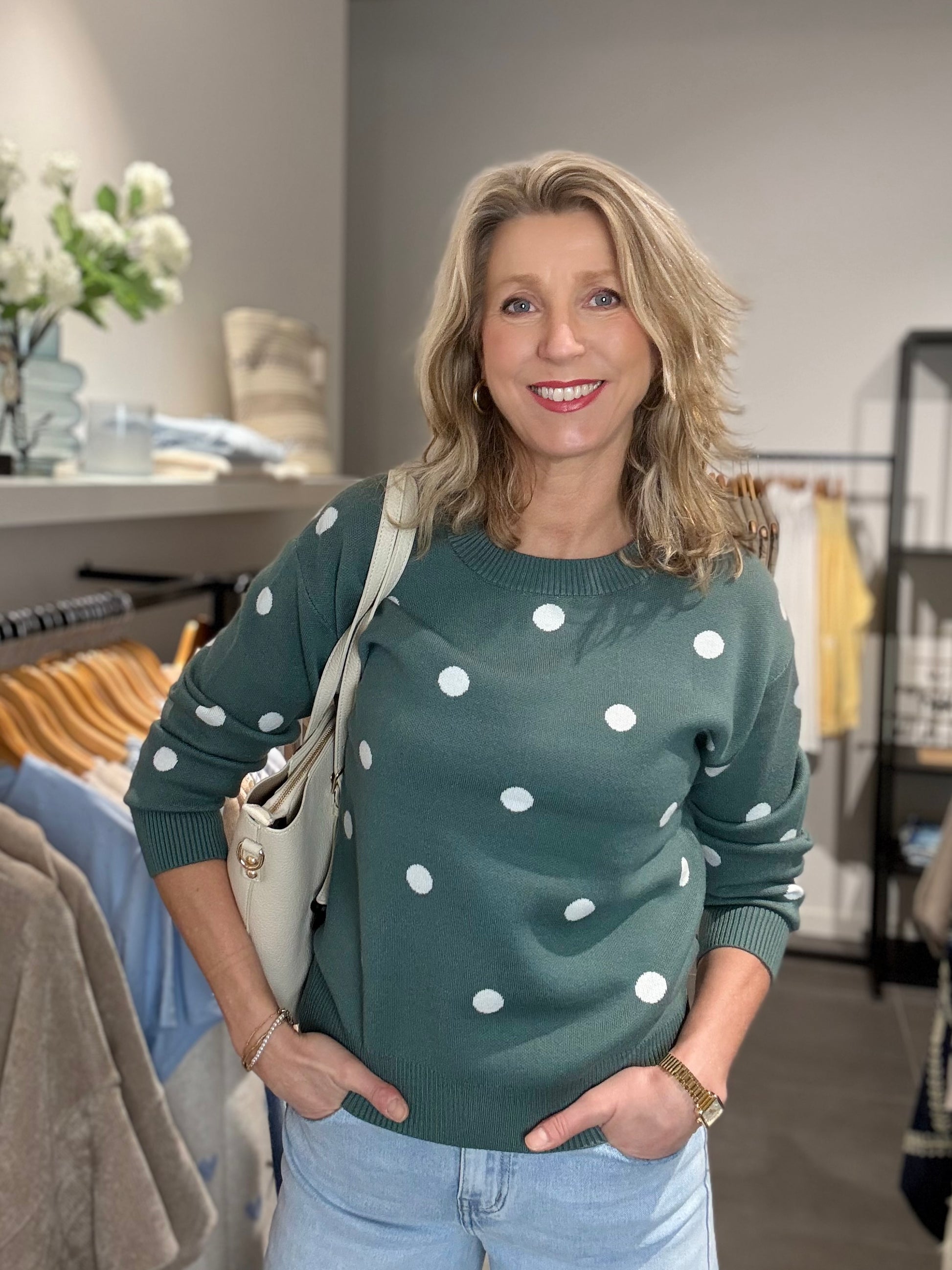 Trui met leuke speelse dotjes print ingebreid. De trui heeft lange mouwen en een ronde hals. Geen wol, 52% viscose dus draagt het hele voorjaar fijn.