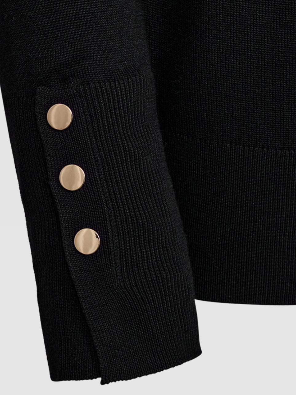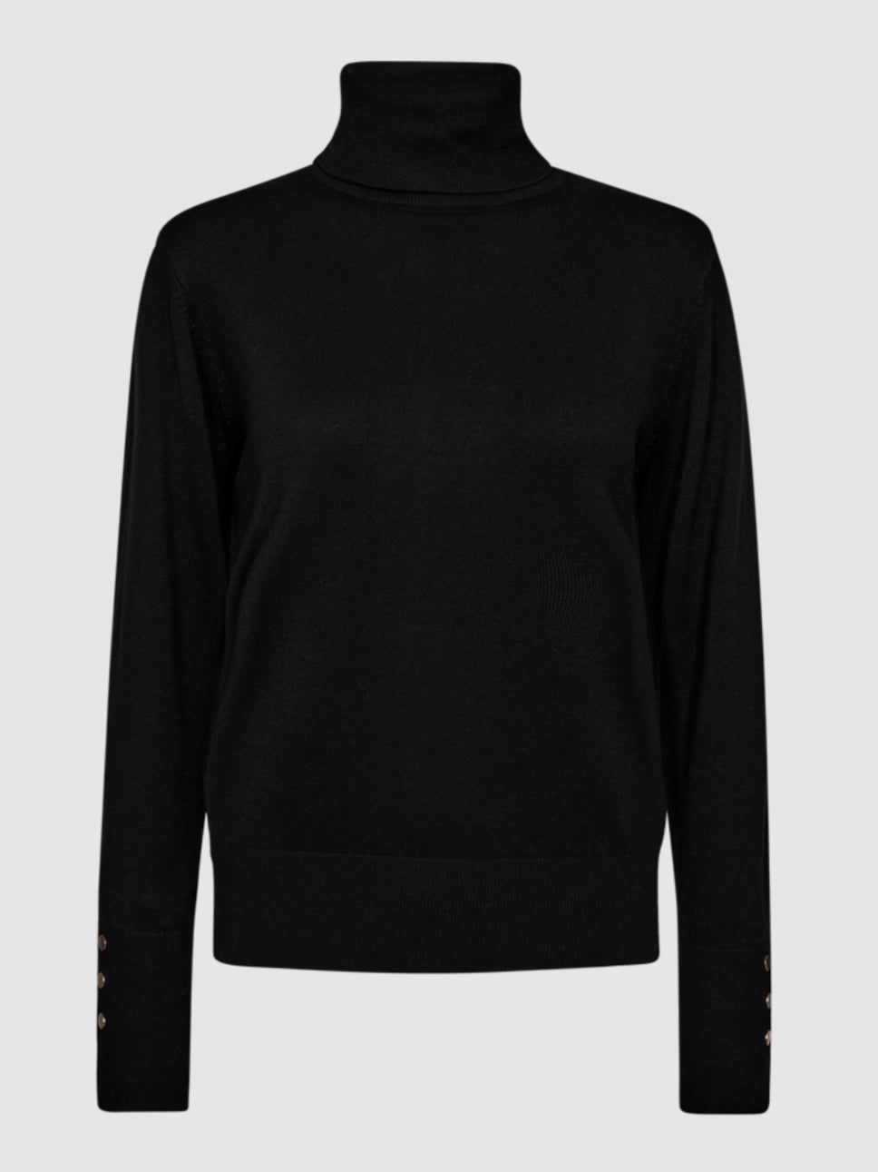 Fijnbrei coltrui met gouden sierknoopjes langs de manchetten. Een perfecte basis voor de winter. Draag deze trui zo of combineer deze met een leuk gilet of blazer. Echt een hele mooie kwaliteit.
