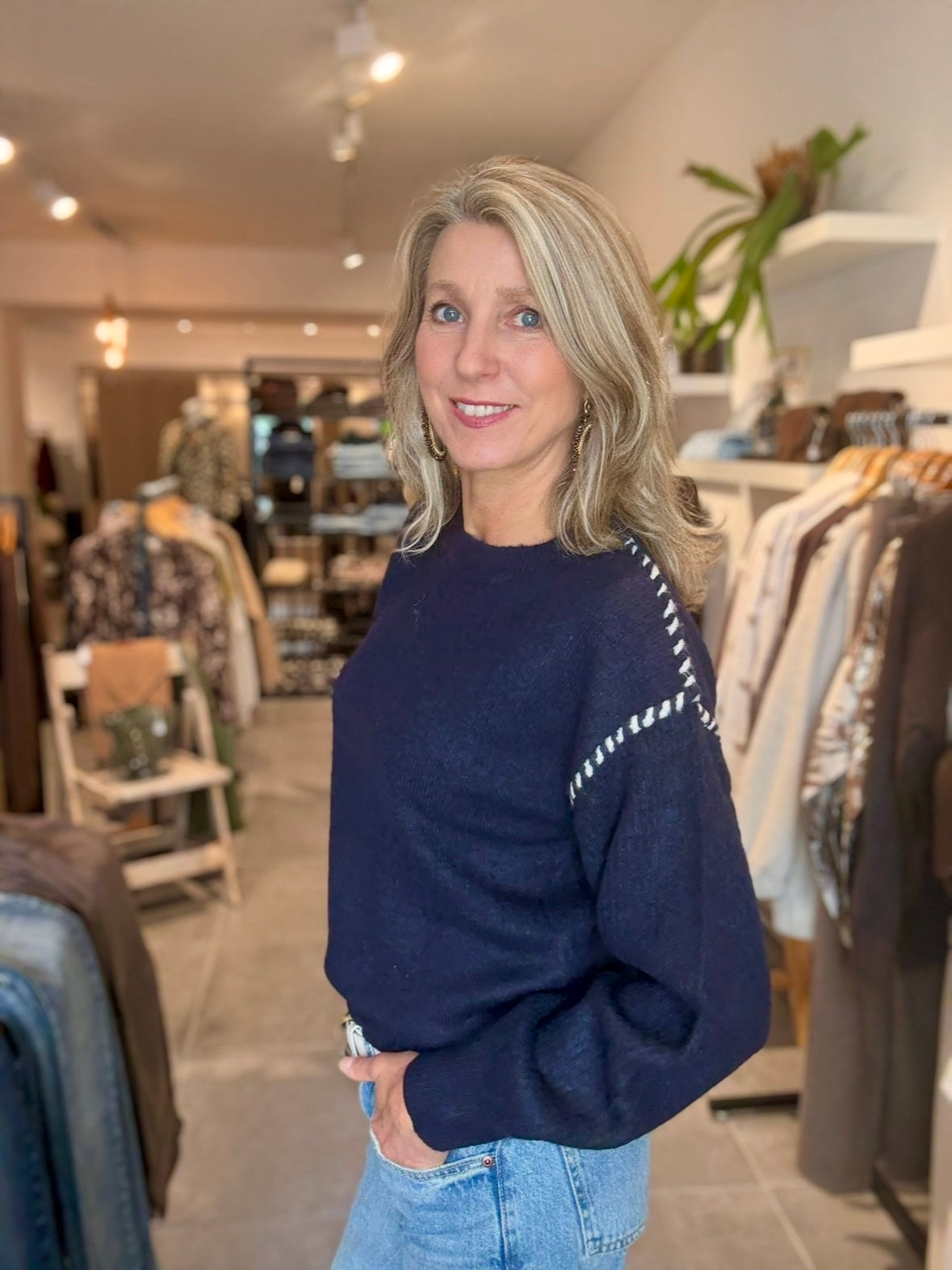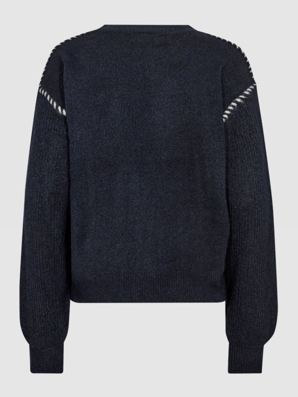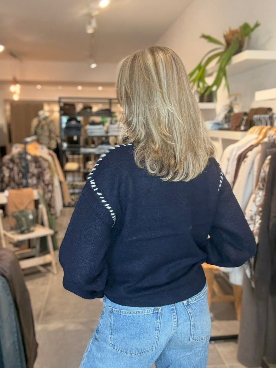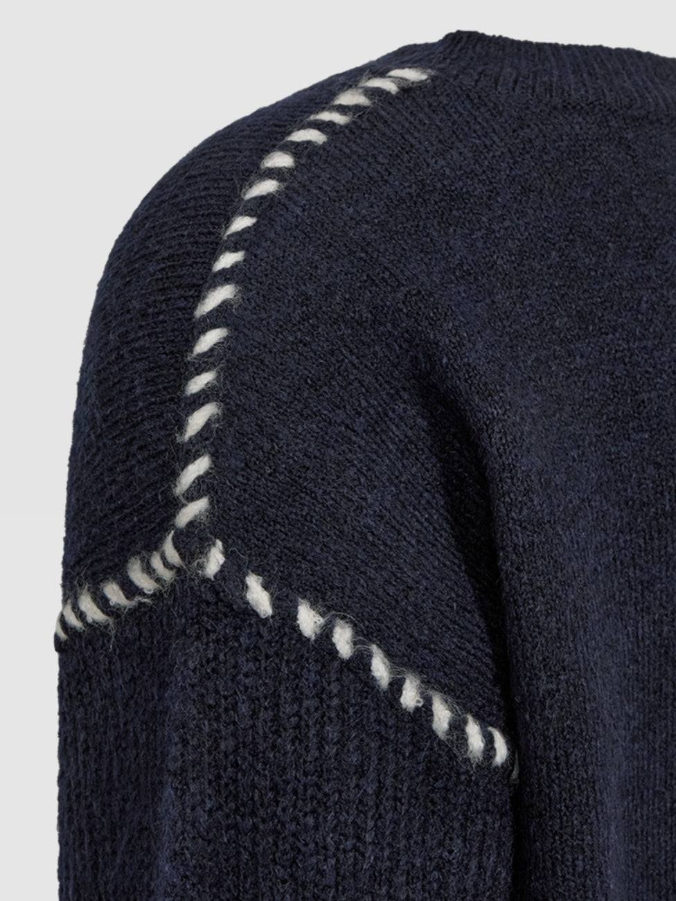 Gebreide trui met leuke stiksel accenten langsd de naden/schouders. De trui heeft lange mouwen en een ronde hals.
