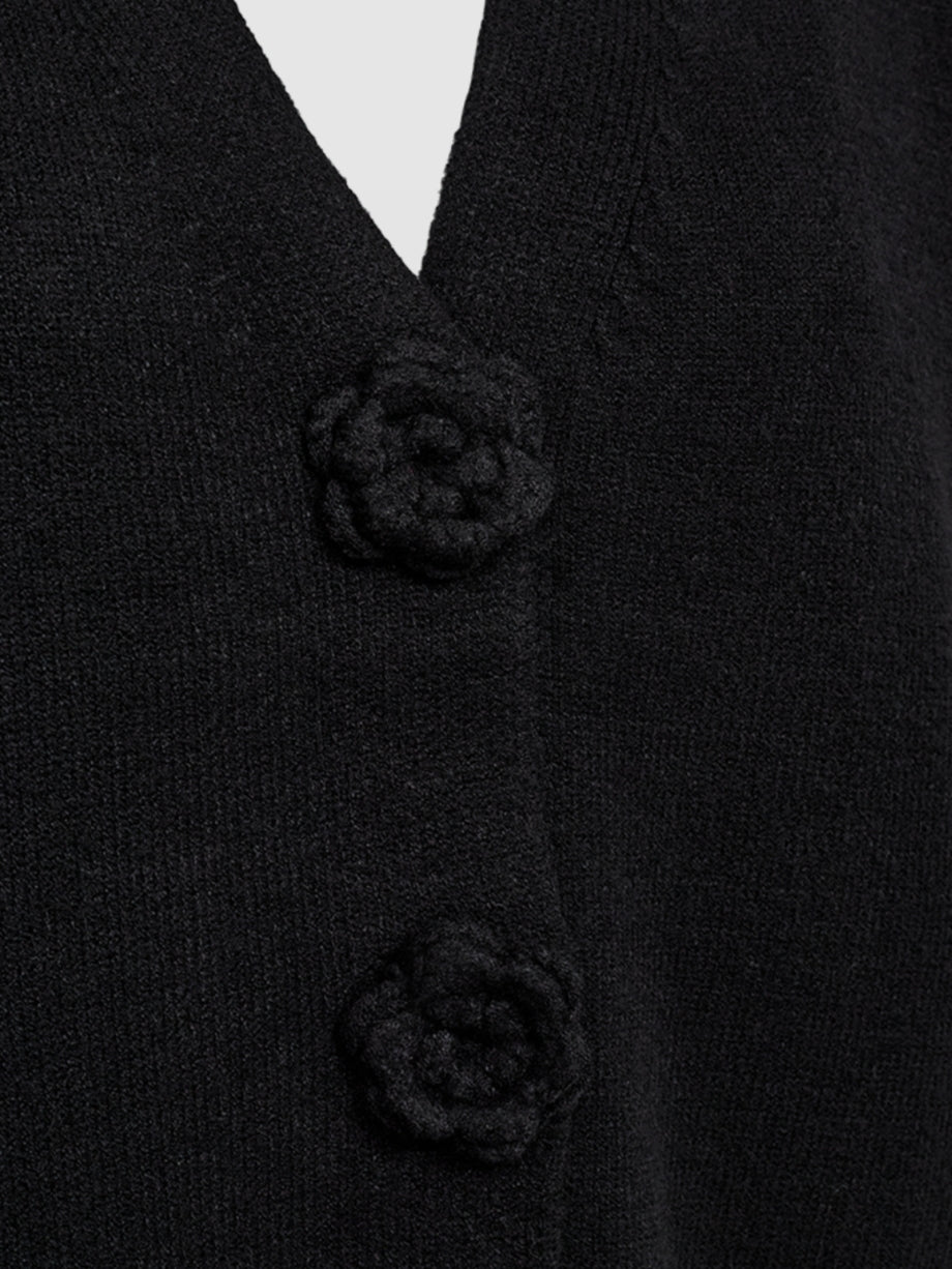Gebreid kort vest met korte kimonomouw en gebreide rozen op de drukknopen.