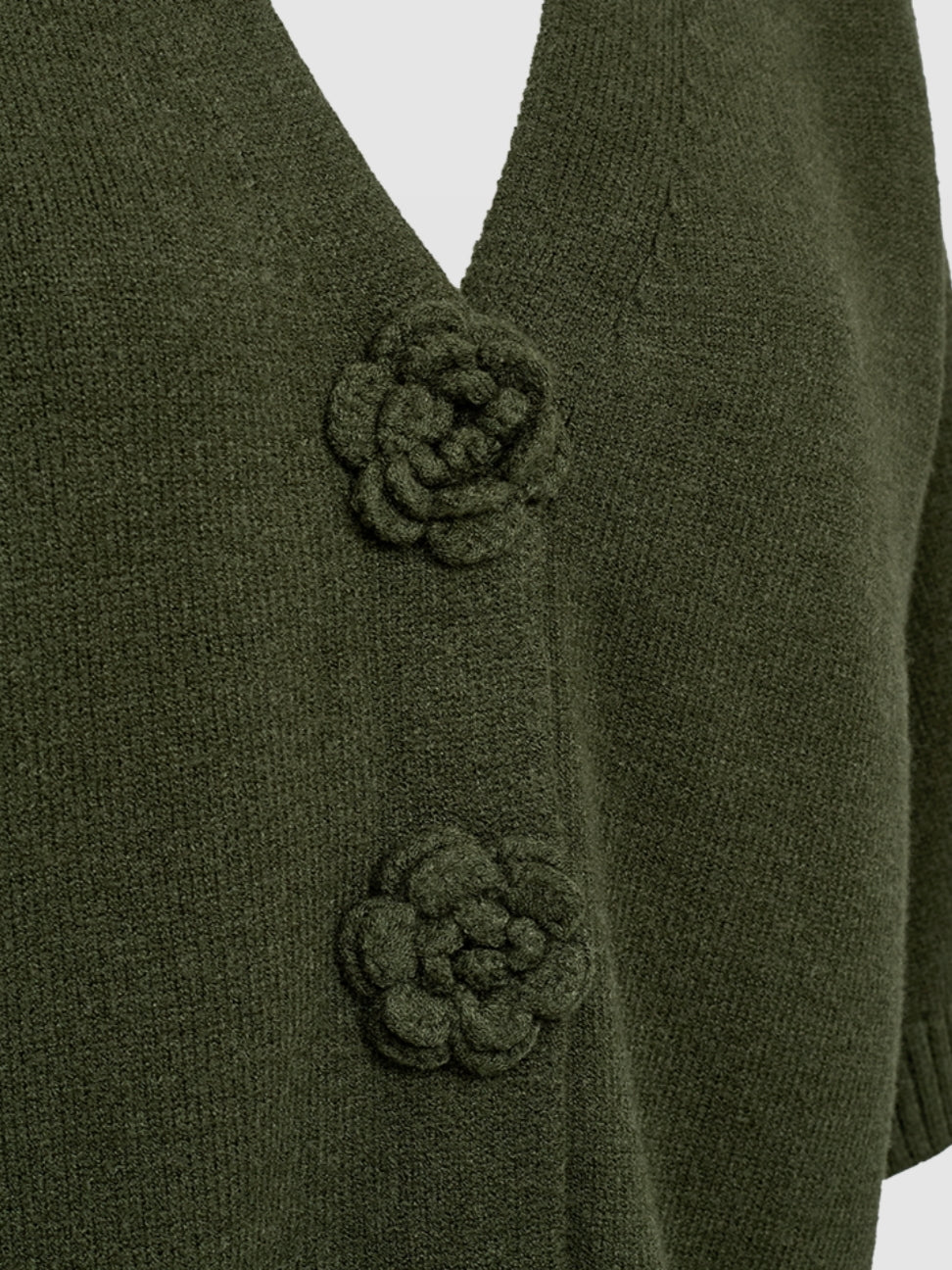 Gebreid kort vest met korte kimonomouw en gebreide rozen op de drukknopen.
