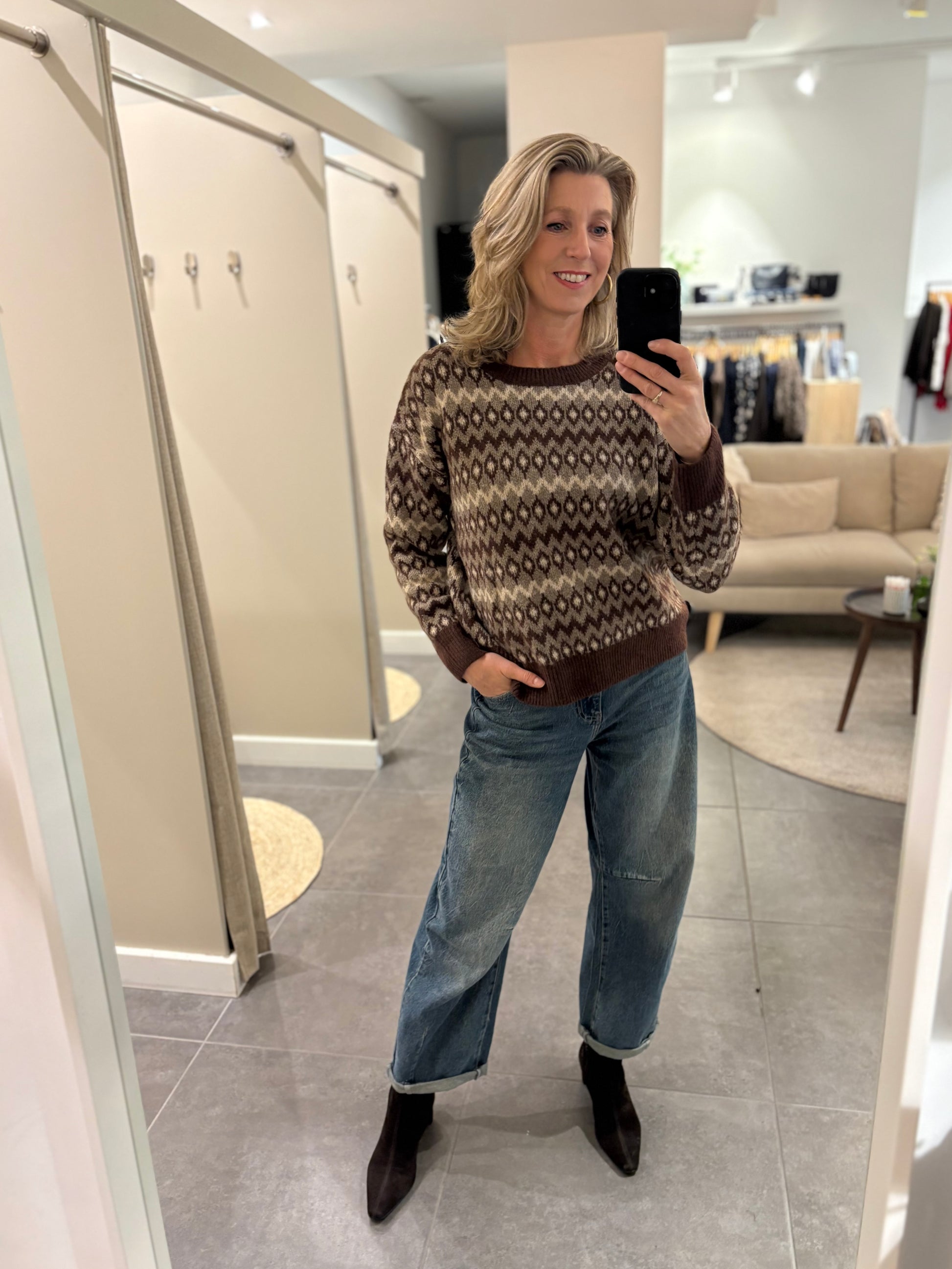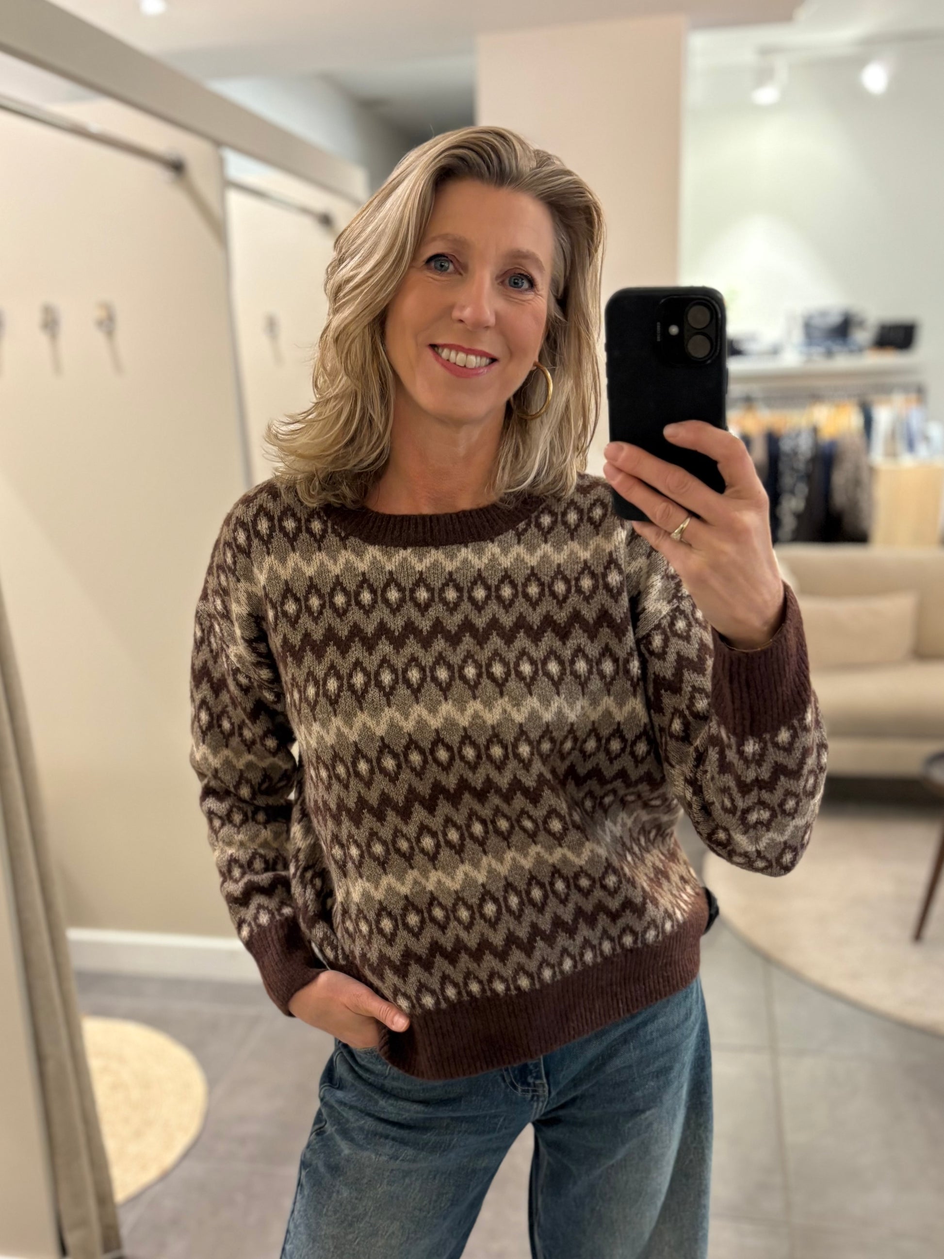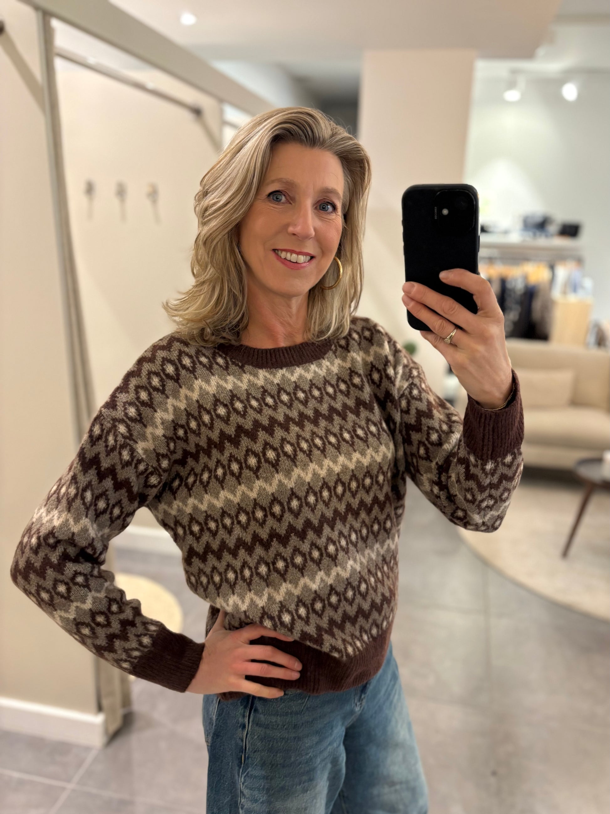 Heerlijke trui met een traditioneel winters breipatroon in bruin- en beigetinten. De trui heeft lange mouwen en een ronde hals.