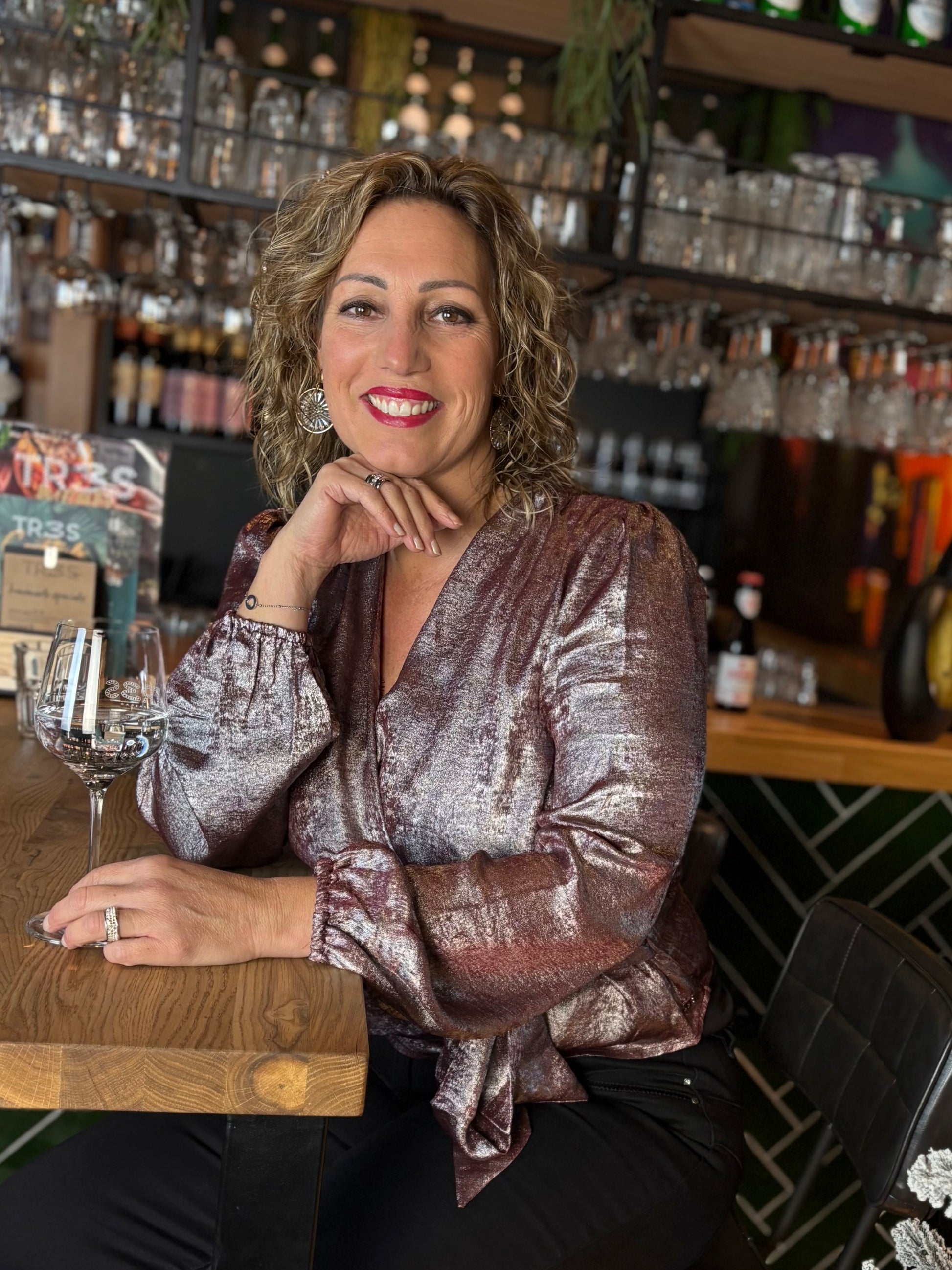 Vrouwelijke blouse met een feestelijke uitstraling door de metallic glans en de mooie overslag met strik. De top heeft lange mouwen.