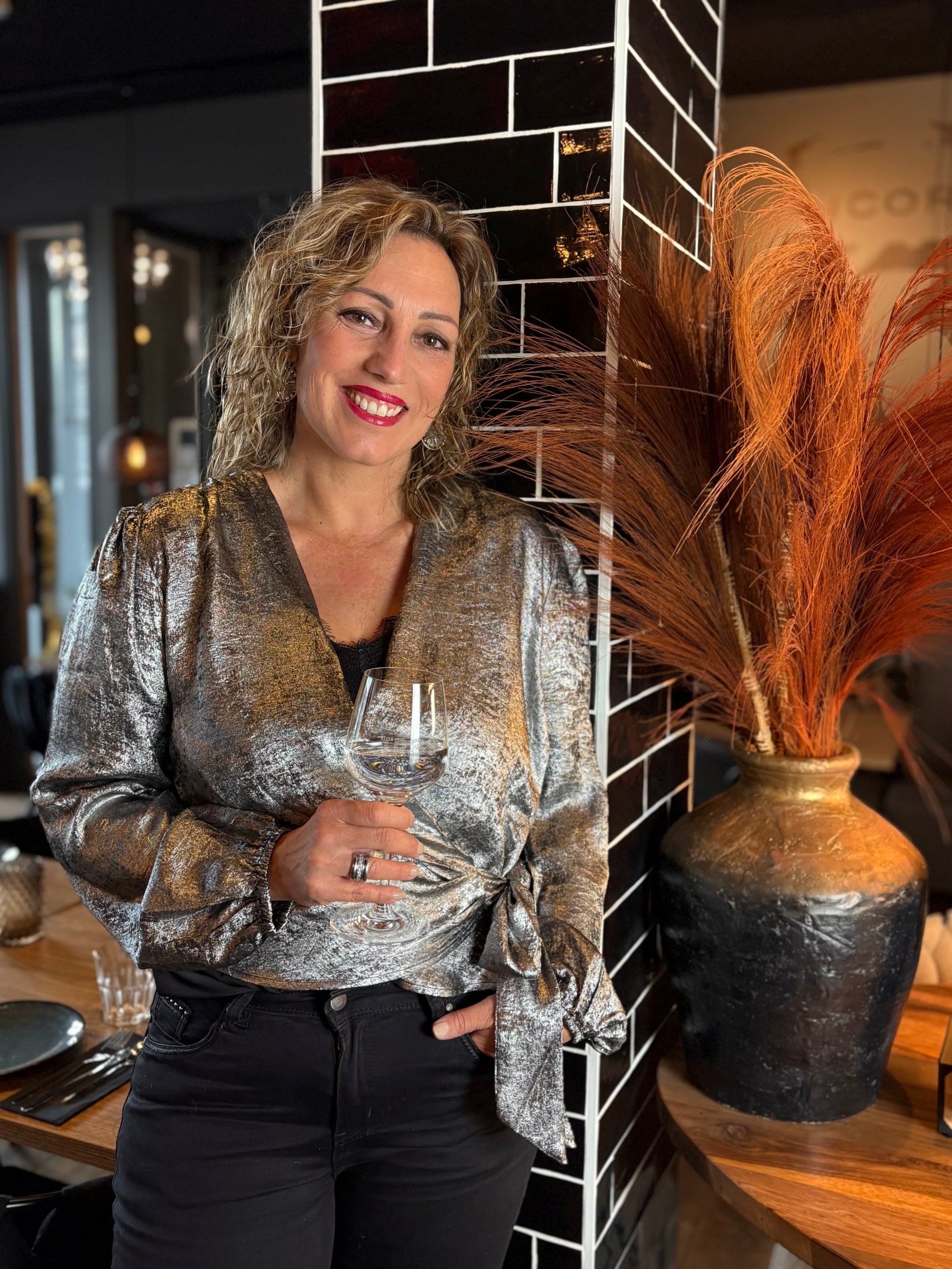 Vrouwelijke blouse met een feestelijke uitstraling door de metallic glans en de mooie overslag met strik. De top heeft lange mouwen.