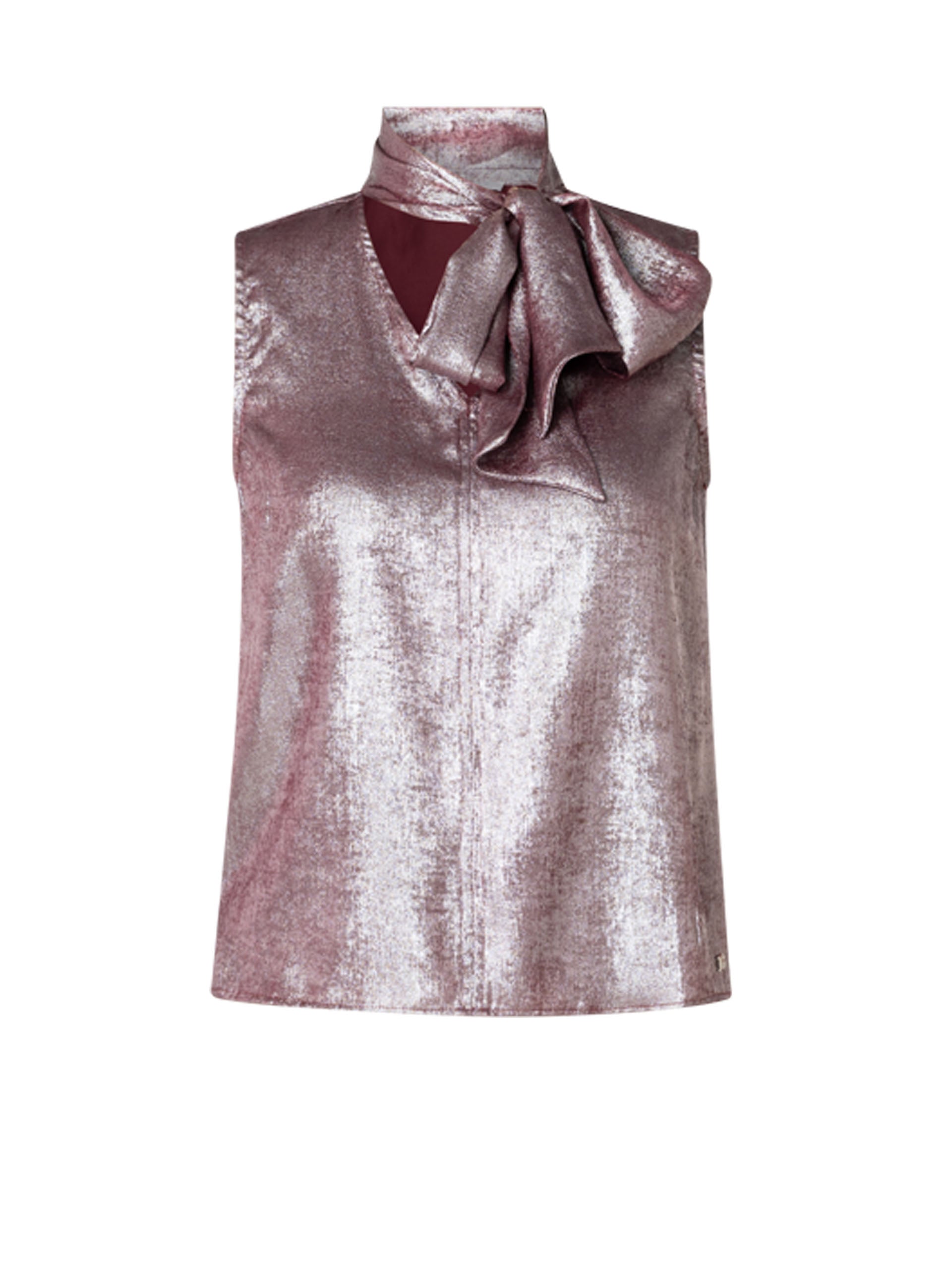 Mouwloze top met met metallic look. De top heeft een V-hals en lint om te strikken in de hals.