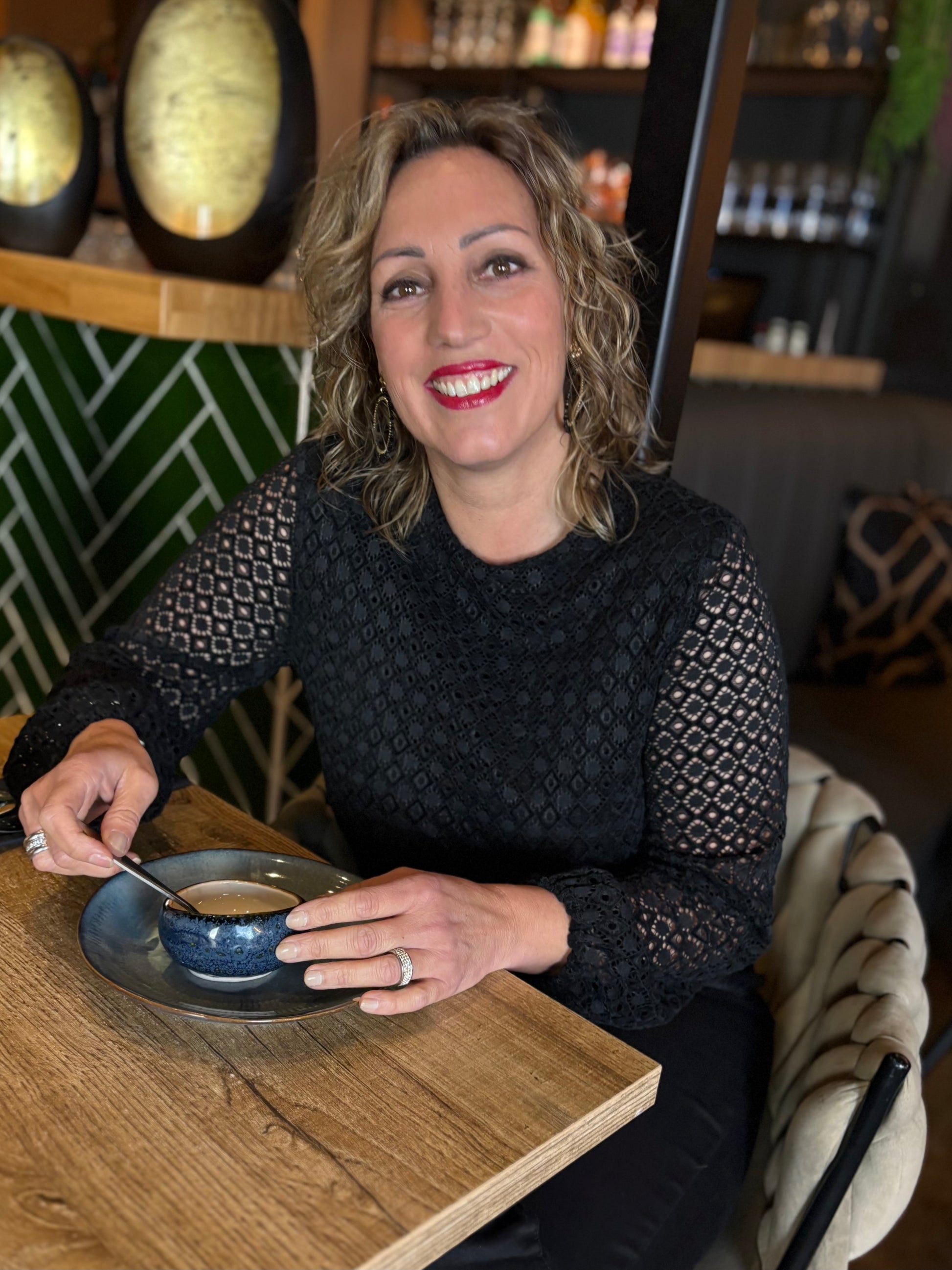 Kanten top met ronde hals en lange mouwen. De top heeft een splitje met knoopsluiting achter. Het lijfje van deze top is gevoerd.