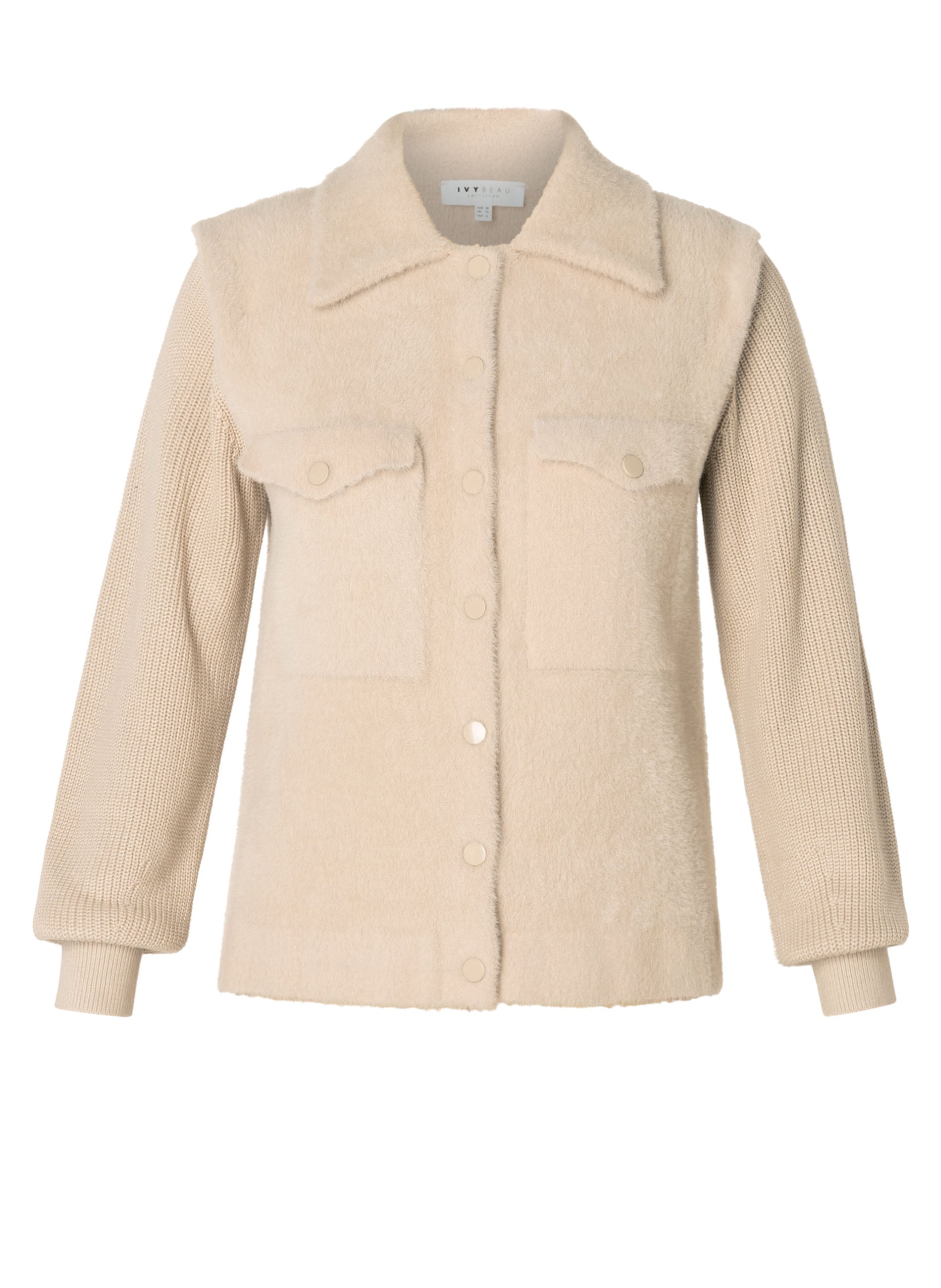 Prachtig vest met gebreide mouwen en het lijf is van imitatievacht. Het vest sluit met drukknopen, heeft borstzakjes en een kraag.