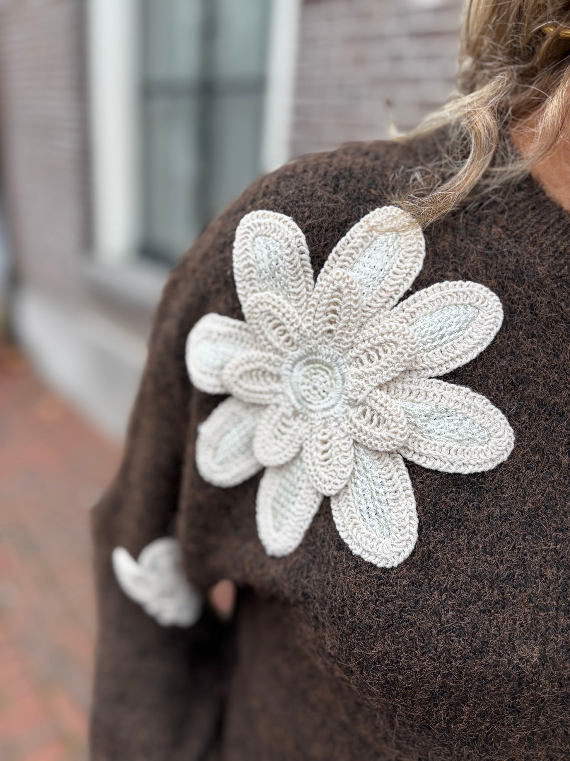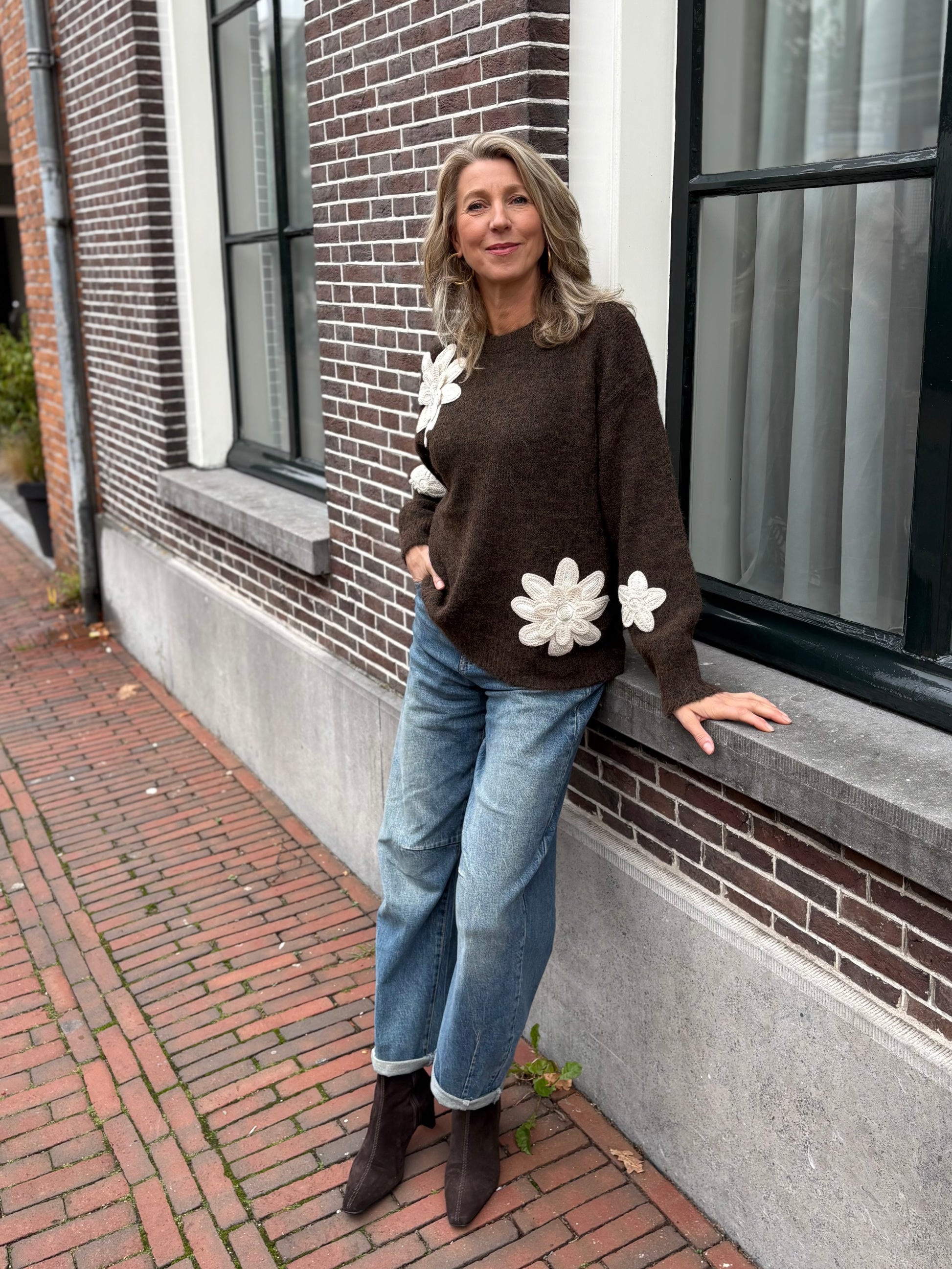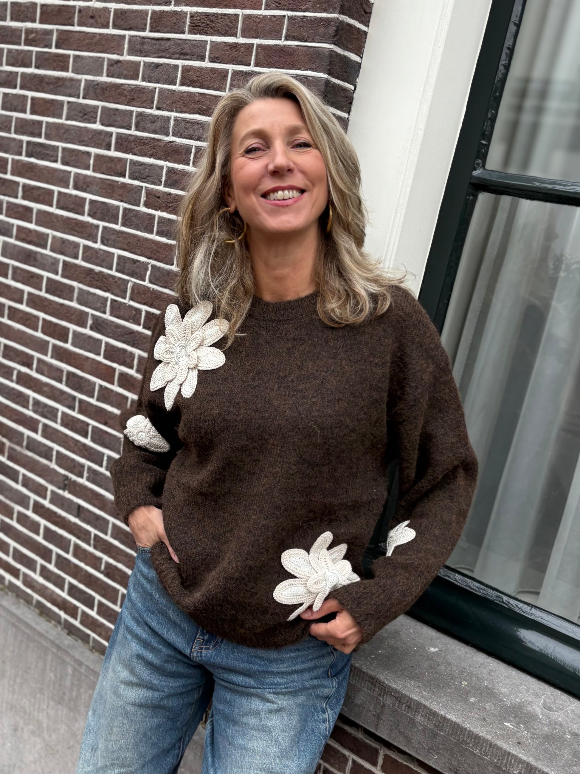 J'aime Olyto trui bloem applicatie bruin/ecru/lichtzand