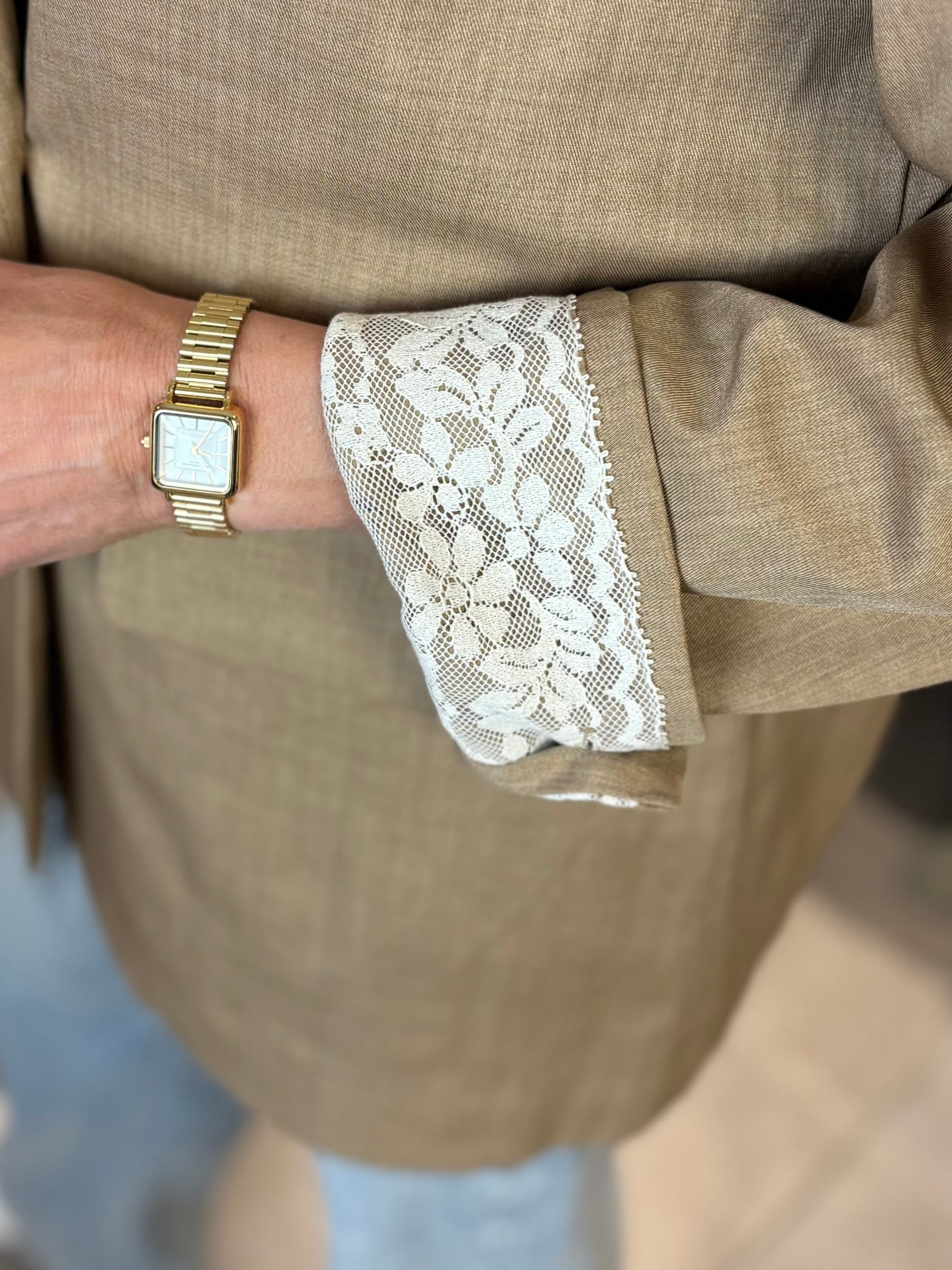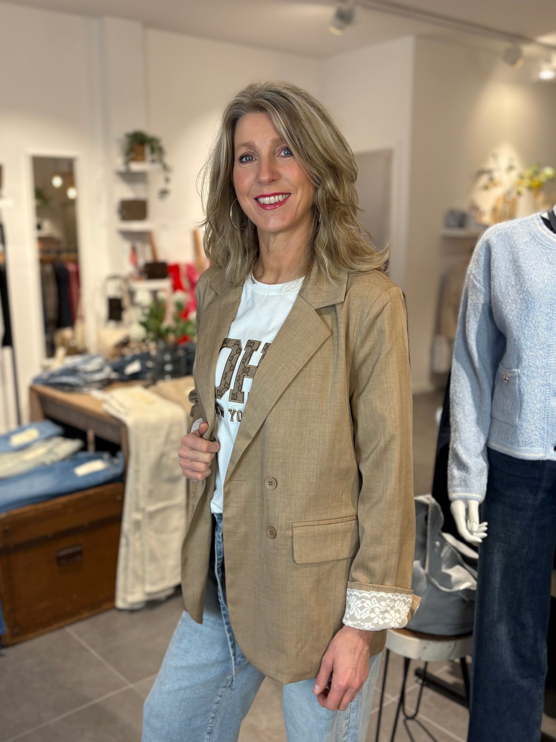 Lekker oversized blazer met double breasted sluiting en 2 knopen aan de manchetten. De blazer heeft een heel leuk accent aan de mouwen, namelijk een kanten binnenkant. Erg leuk als je de mouwen een stukje omslaat. De blazer is gevoerd en heeft klepzakjes. Combineer met een mooie blouse, fijnbrei truitje of stoer met een T-shirt.