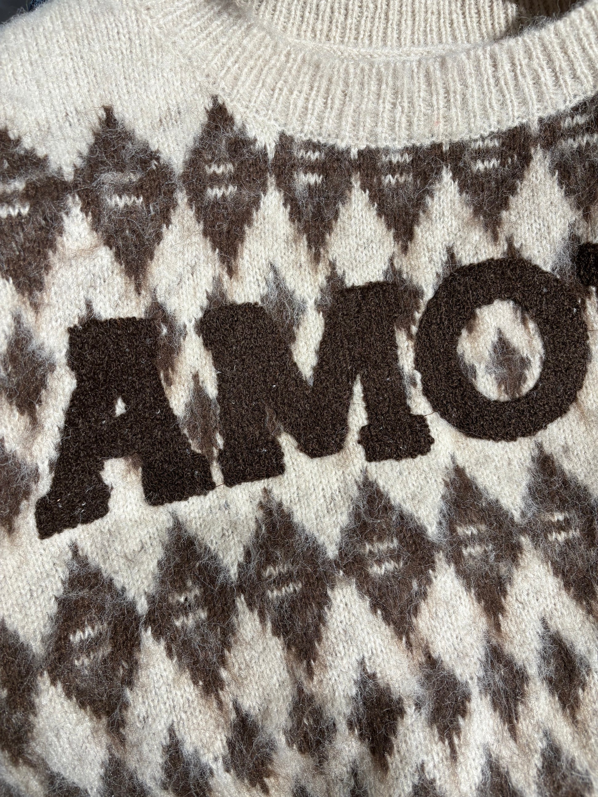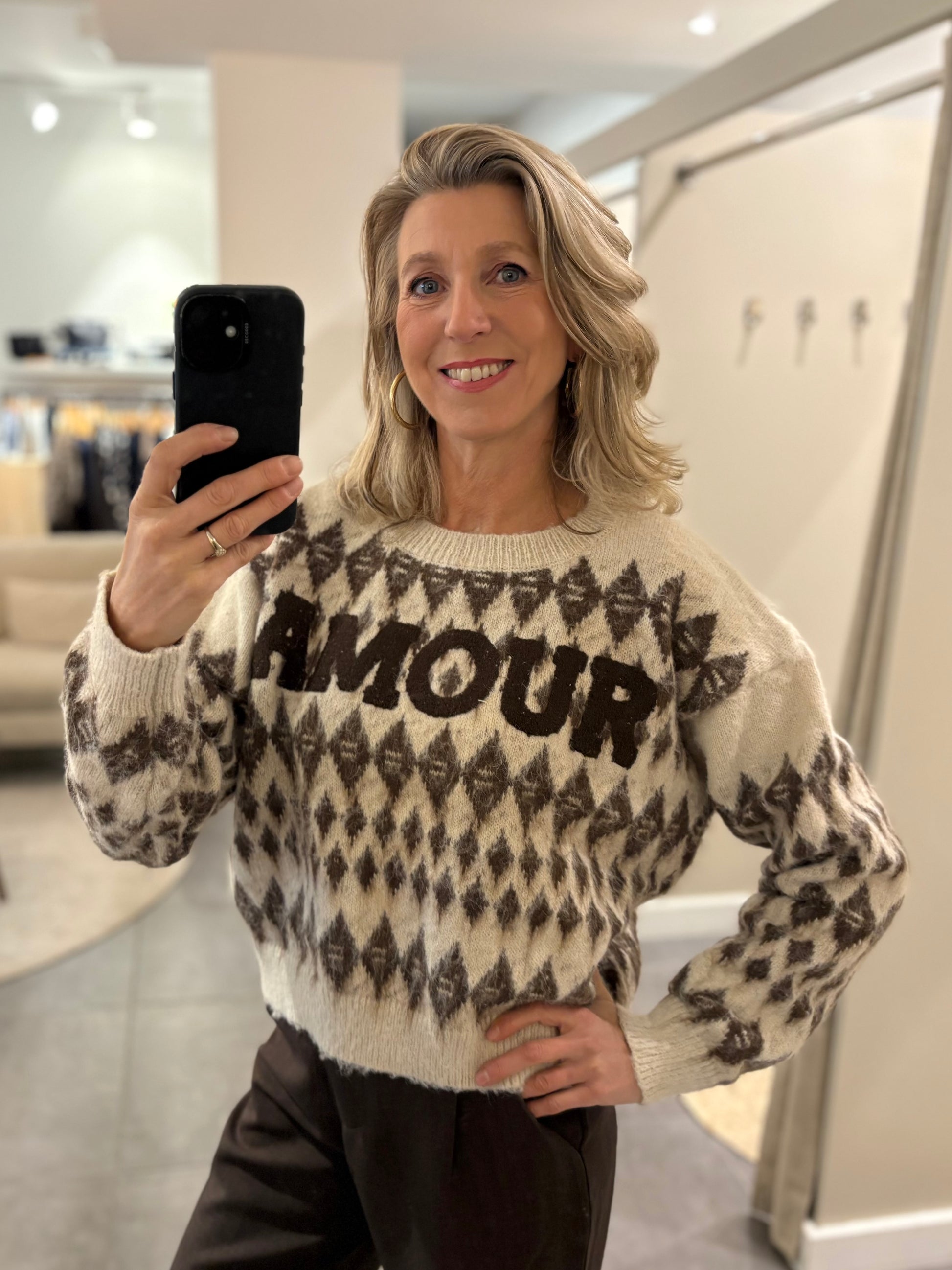 Trui met leuk winters breipatroon en de tekst AMOUR in badstof op het voorpand.