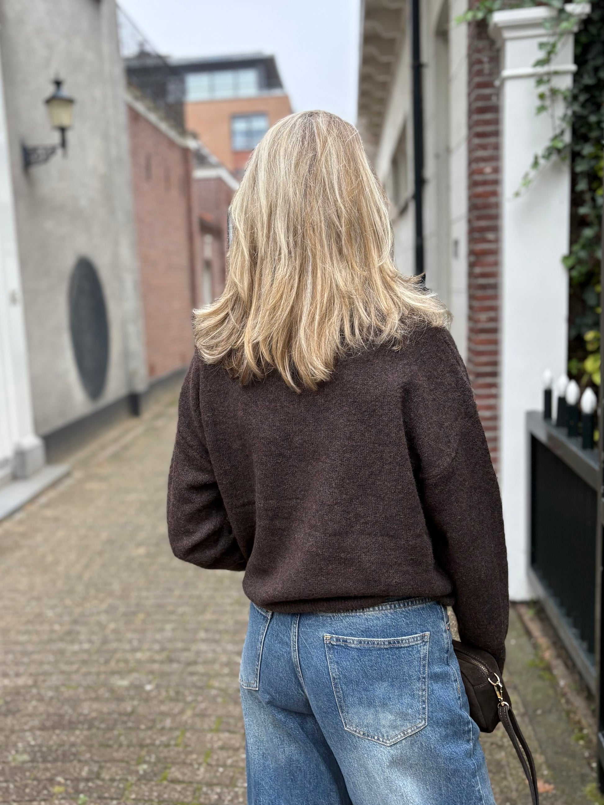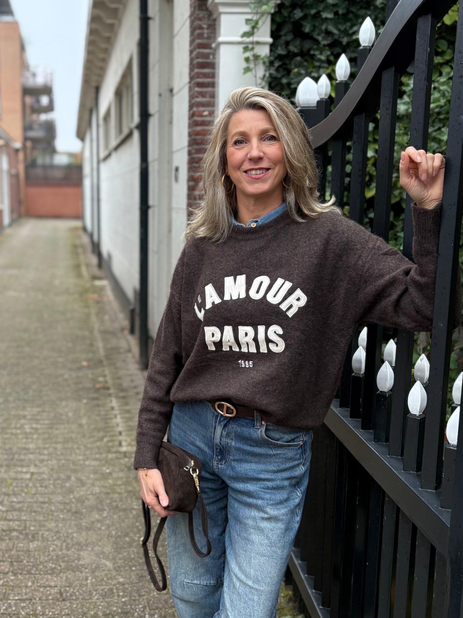 Zachte gebreide, wollige trui met L'AMOUR PARIS in suedine letters op het voorpand.