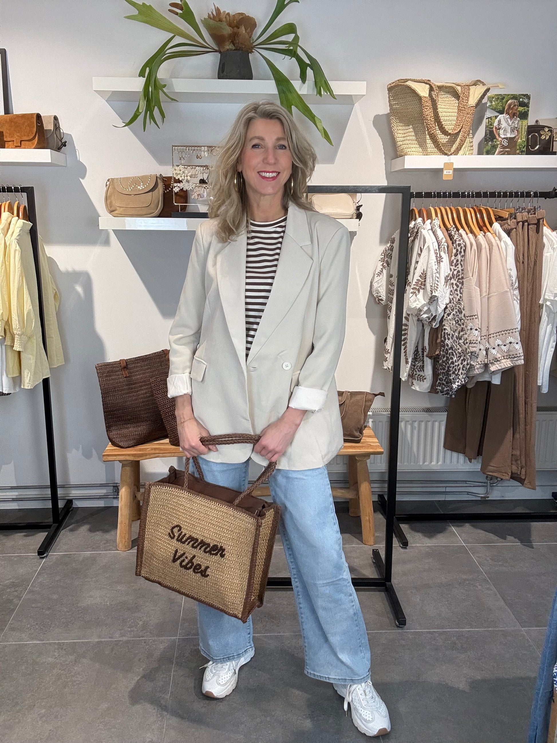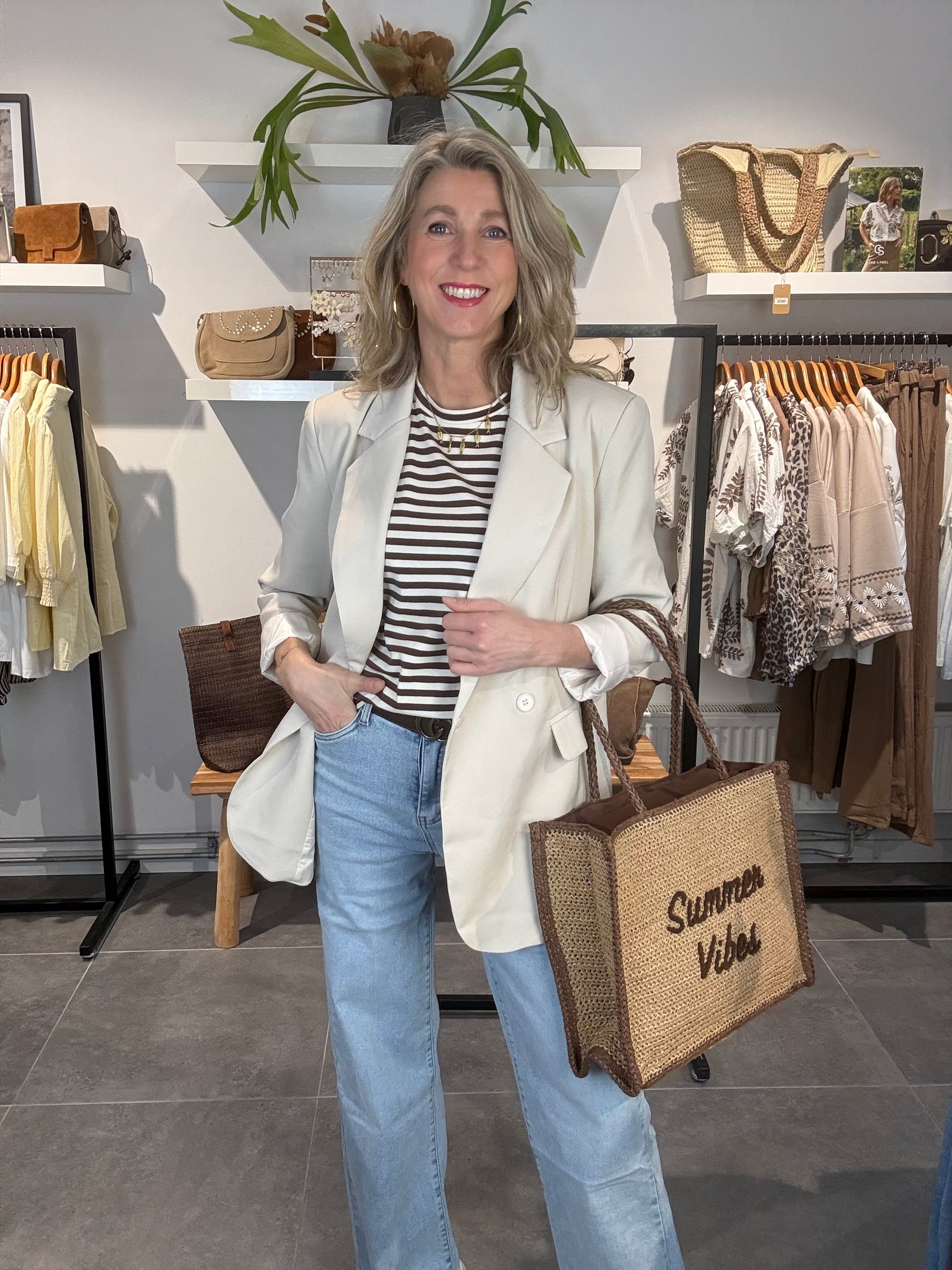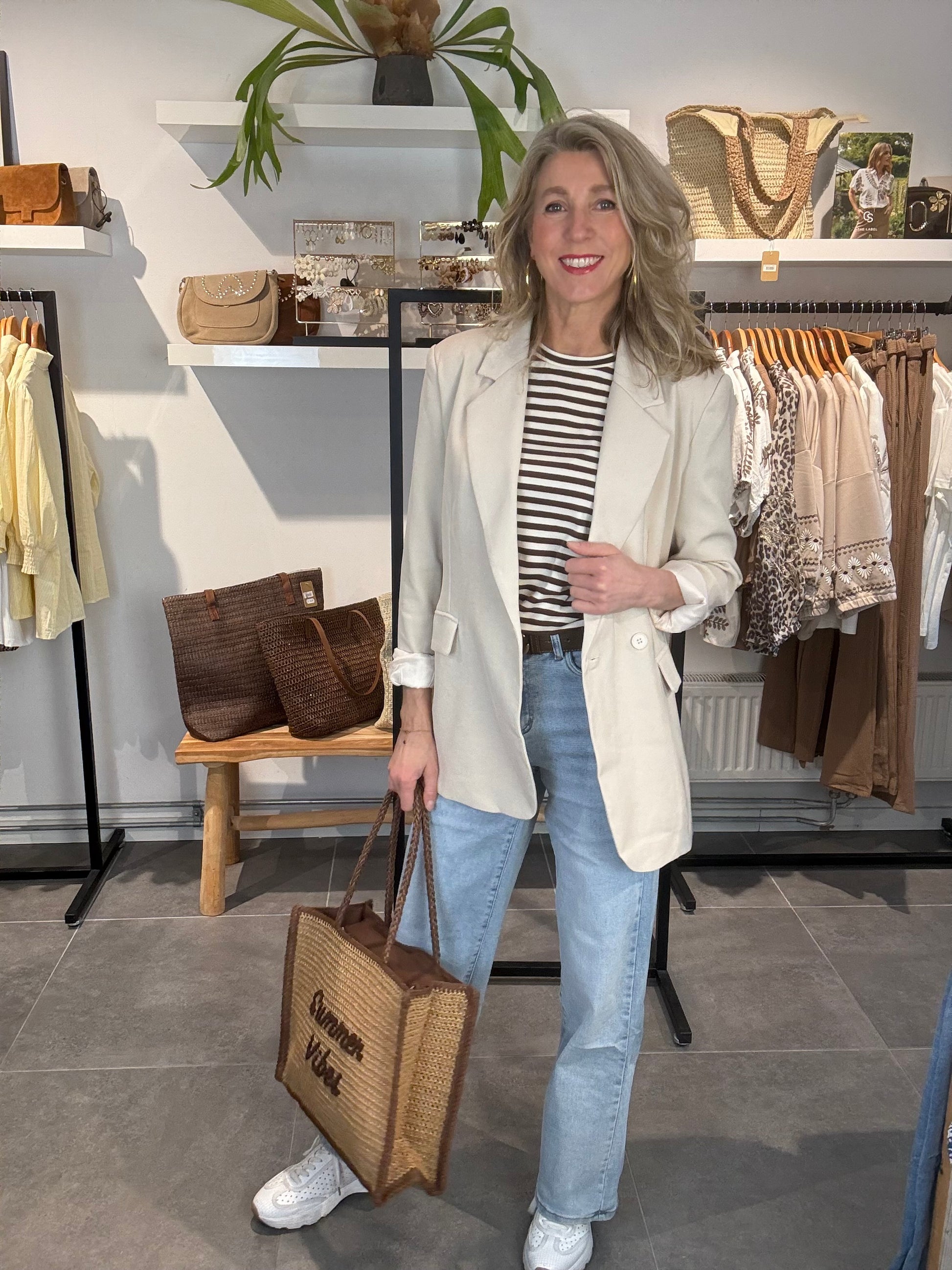Blazer met oversized fitting en split met knoop op de rub. De blazer heeft klepzakjes en een double breasted sluiting. De blazer is gevoerd.