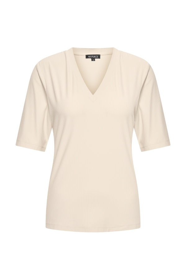 T-shirt met V-hals in hoogwaardige travelkwaliteit. Het shirt heeft een ribbel in de stof.  Travelstof draagt erg comfortabel, kreukt en zweet niet en blijft lang mooi.