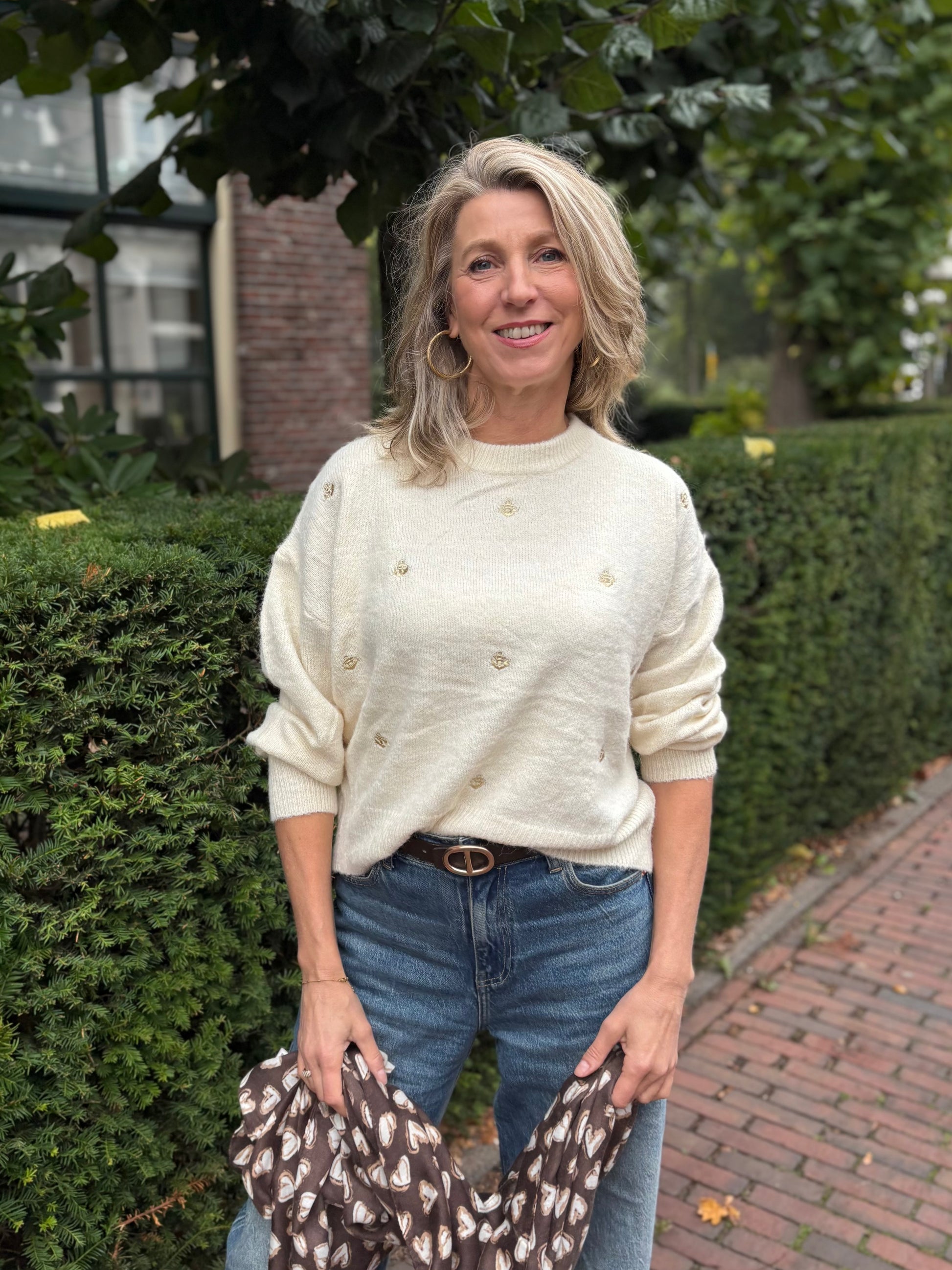 Gebreide trui met wol. De trui heeft goudkleurig geborduurde ankertjes op het voorpand.