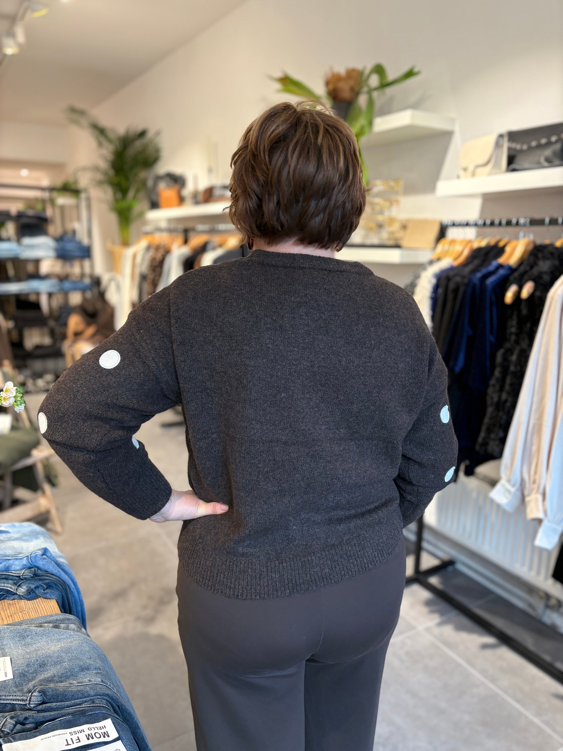 Leuke casual trui met grote stippen op de voorzijde en de mouwen. Deze trui is verkrijgbaar in 1 maat en die past tm maat 42. Het breisel is gemaakt van een mix van polyamide, viscose en wol.