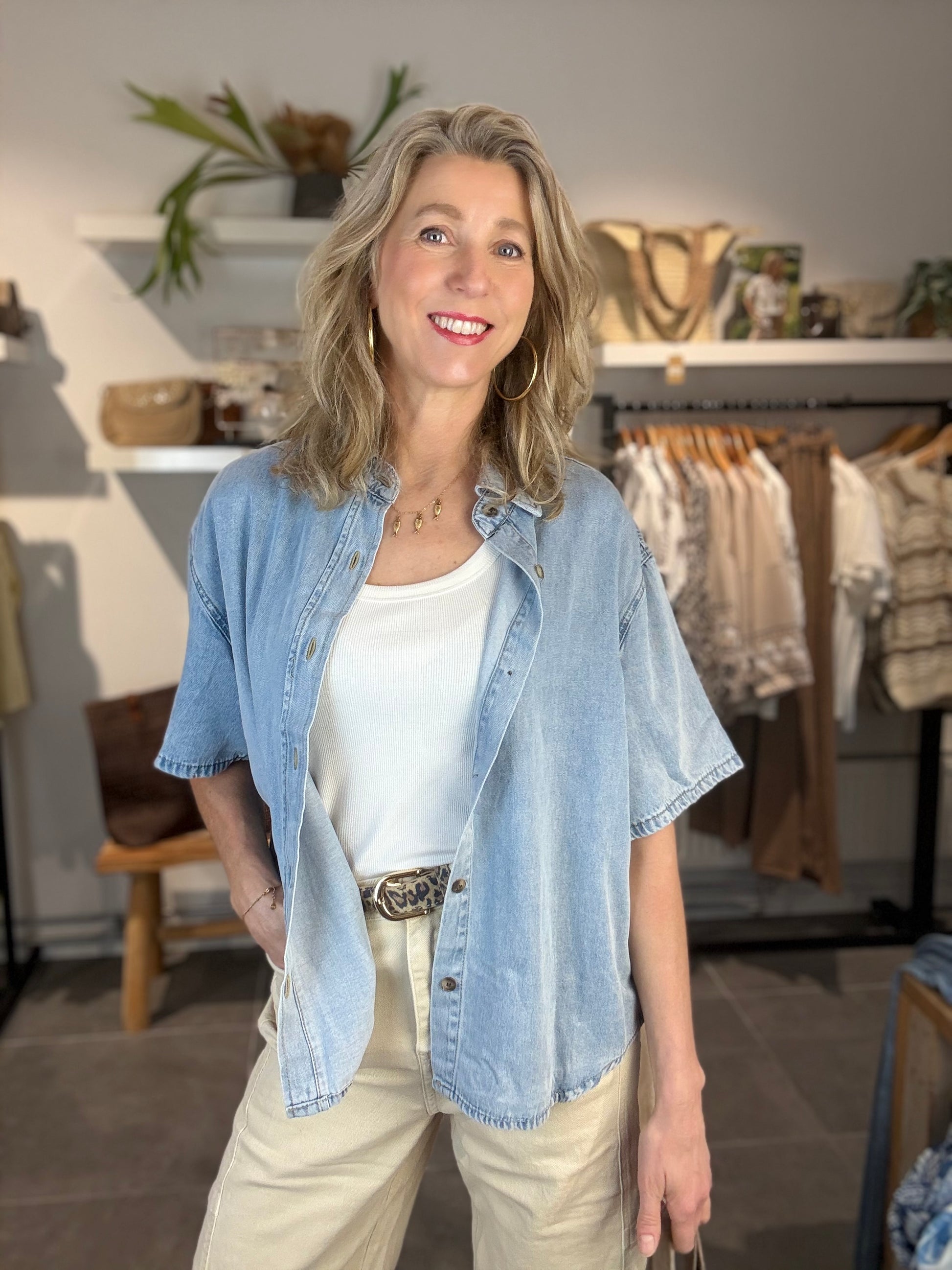 Leuk stoer model jeansblouse met korte mouwen en een kraag. Leuk als blouse maar ook open met een hemdje te dragen.