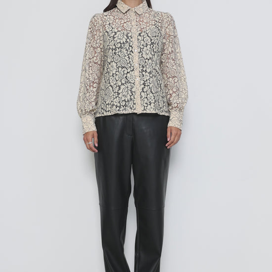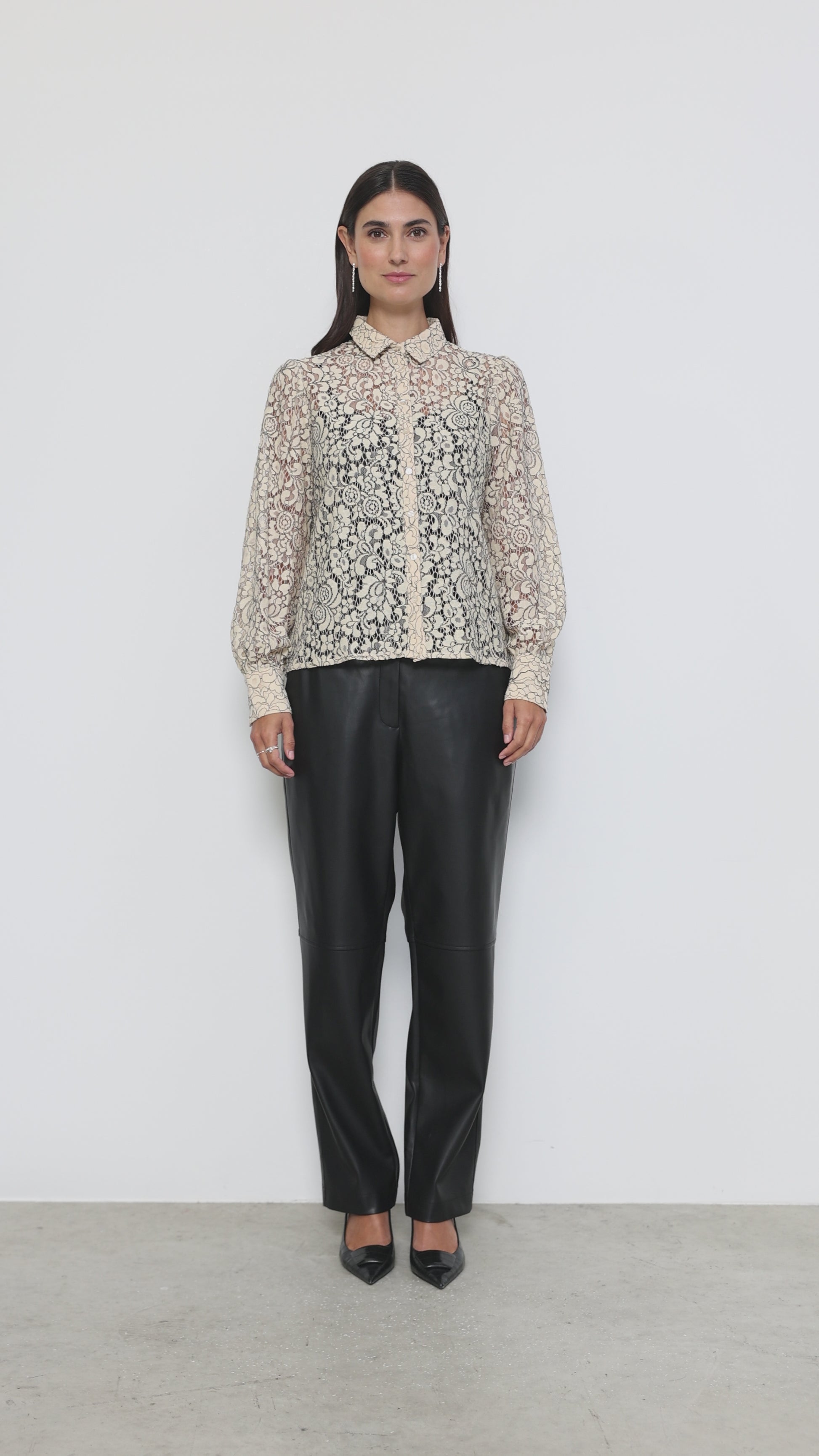 Kanten blouse met pofmouwen en kraag. Draag er een zwarte top onder voor een extra accent.