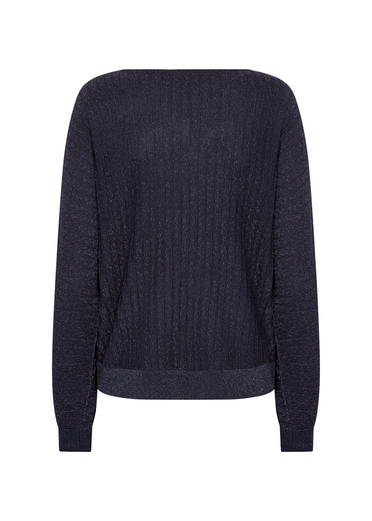 Feestelijke top met een verticale ingebreide ribbel en blauwe glitters in de stof. De top heeft vleermuismouwen en een ronde hals.